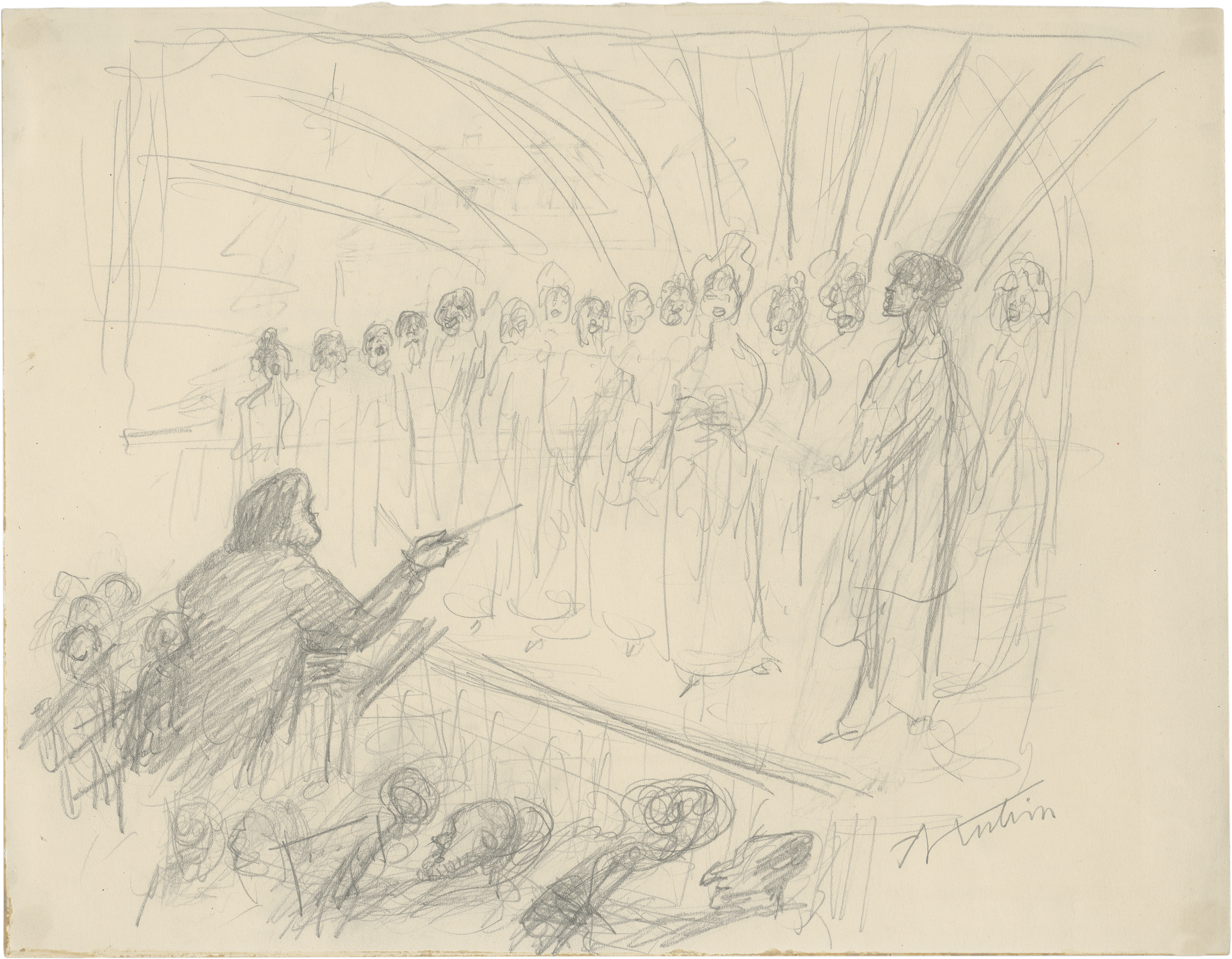 In der linken unteren Ecke platziert Kubin den Dirigenten mit erhobenem Stab zwischen dem Orchester, die Sänger auf der Bühne anleitend. Schöne, skizzenhafte Zeichnung, wohl als Entwurf für eine graphische Fassung des Themas gearbeitet, verso mit einer weiteren Bleistiftskizze des Künstlers.