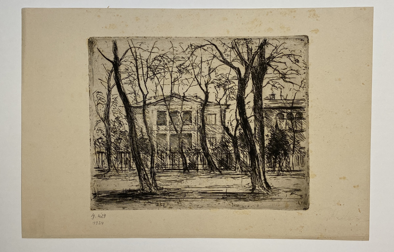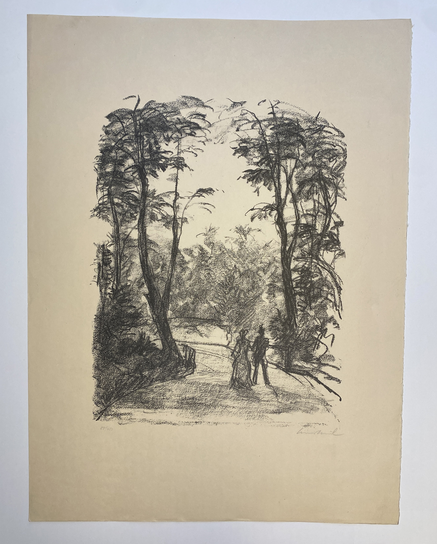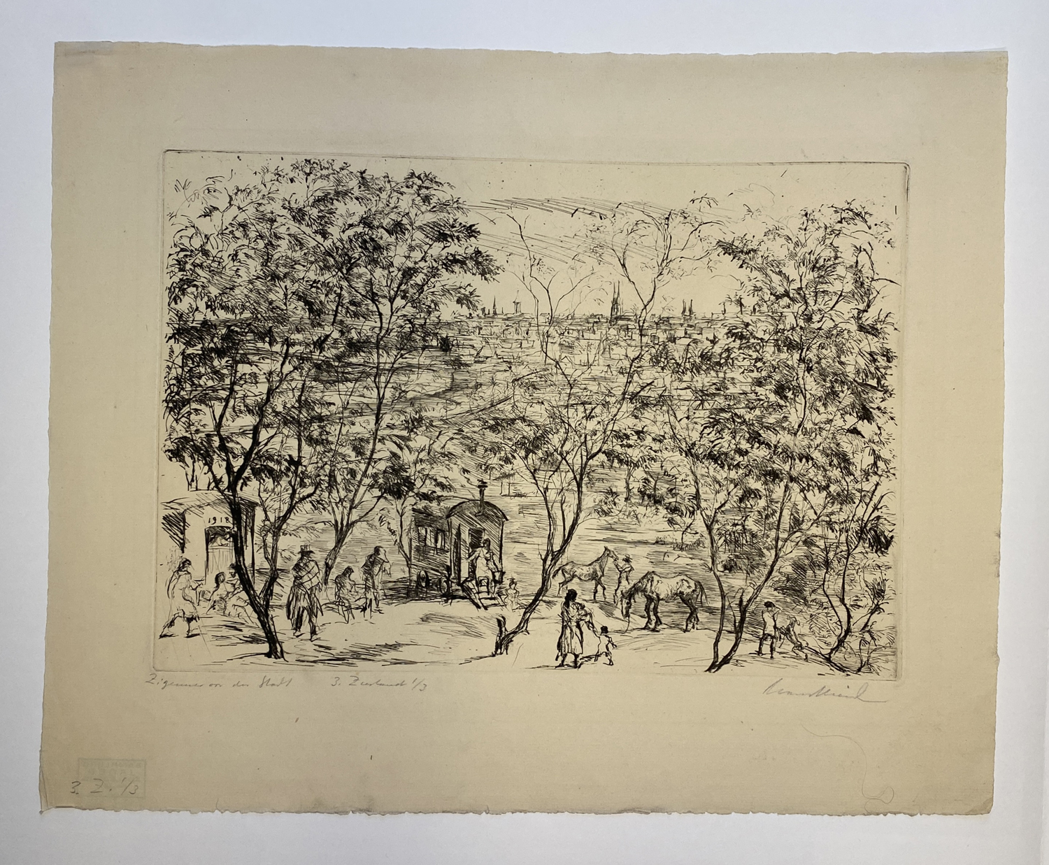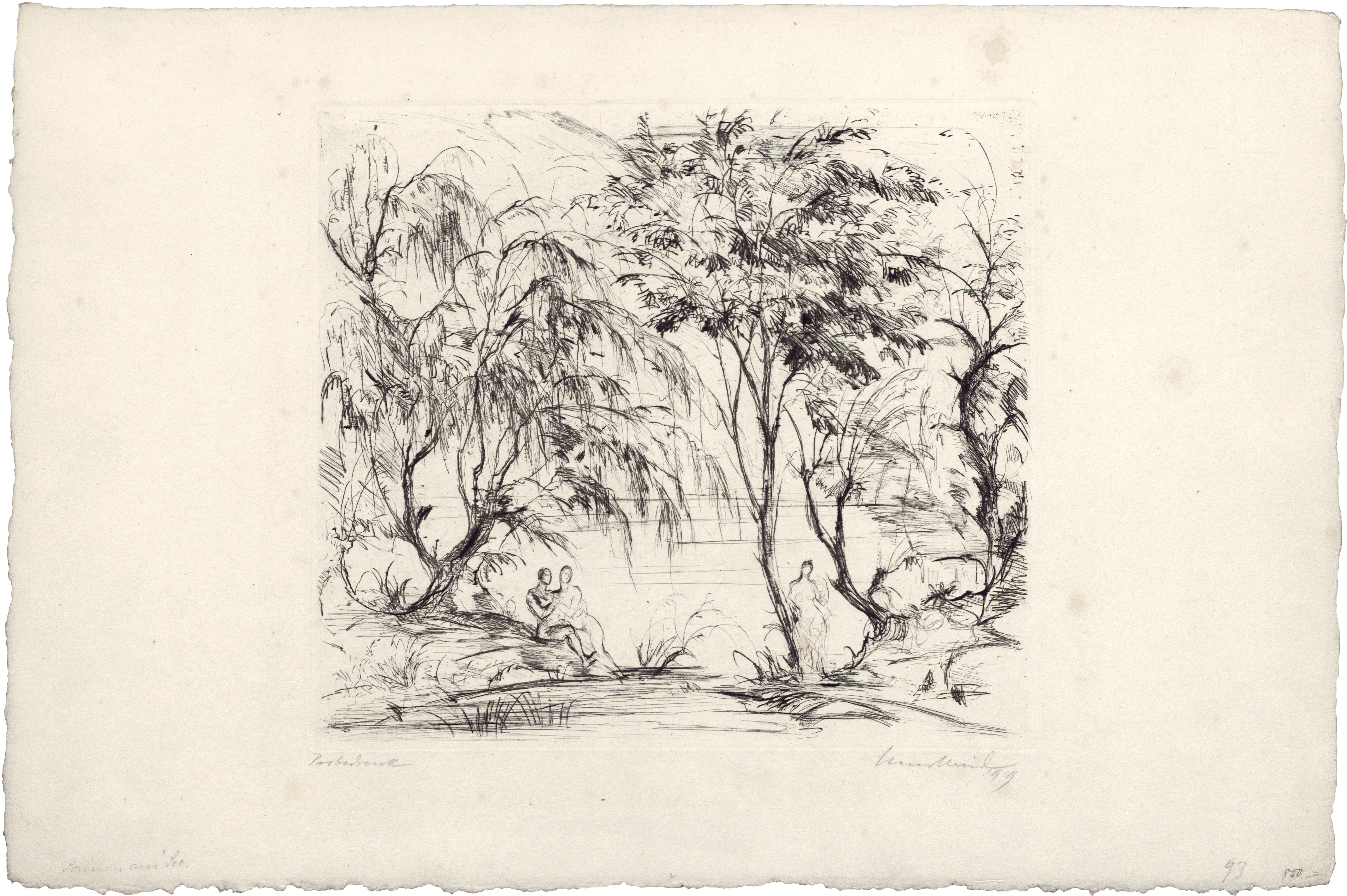 Dabei die Motive "Zigeuner vor der Stadt" (1918, J. 285), "Romantische Entführung" (1918, J. 309), "Sommer am See" (1919, J. 314), "Kahnfahrt" (1924, J. 407), "Zwei Mädchen auf der Insel" (1923, J. 412), "Paar auf dem Waldweg" (1923, J. 415), "Die sterbende Tiergartenstraße" (1924, J. 429) sowie drei Blatt zu Johann Wolfgang von Goethe, Gedichte (1925, J. 503, 505 und 506).