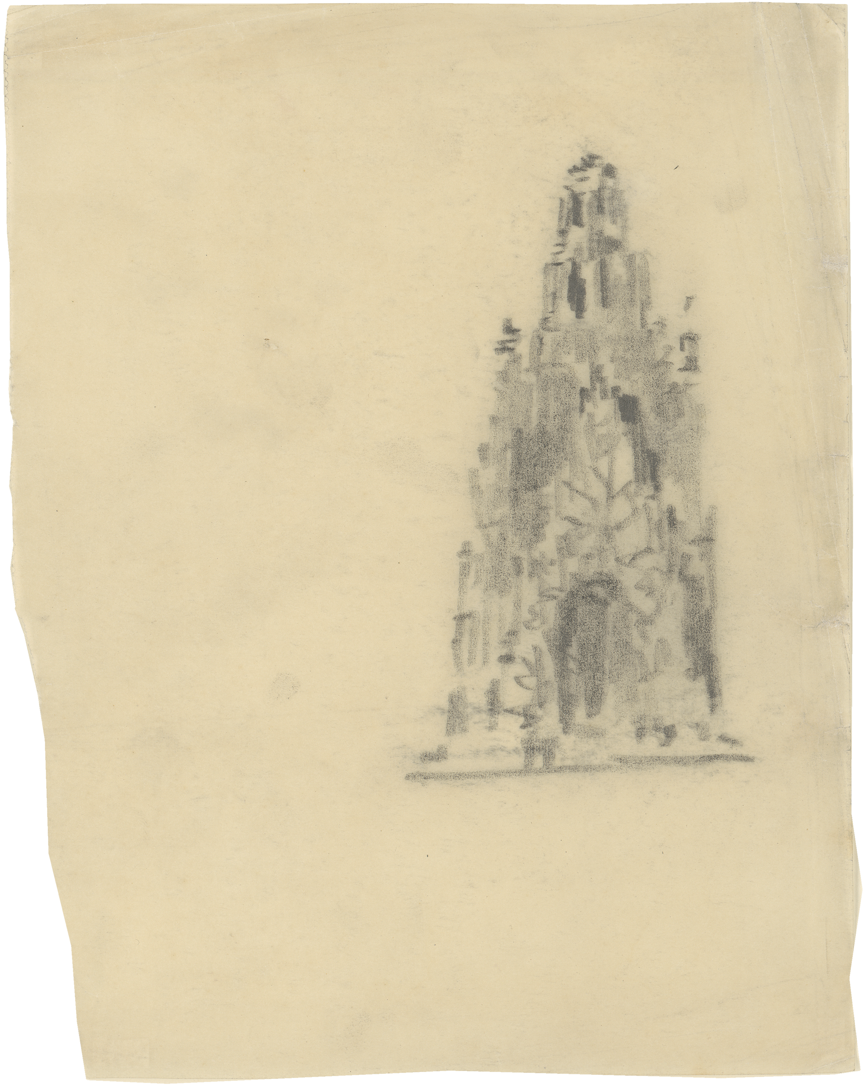 Entwurf für die Weg- oder Grabkapelle der Majolika-Manufaktur Karlsruhe, ein kleines, hohes Gebäude mit einer gestuften Maßwerkfassade. Biraghi vergleicht die Majolikakapelle mit den Arbeiten aus dem Studio der Brüder Luckhardt. "Poelzigs Wegkapelle will eindeutig mehr sein als ein einfacher Ausstellungspavillon der Karlsruher Majolika-Manufaktur. (...) Beispiel sind ihm Tauts Glaspavillon in Köln und das Denkmal für den Stahlwerksverband in Leipzig, die beide über ihre ursprüngliche Funktion, Denkmal der verwendeten Materialien zu sein, hinausgehen." (Marco Biraghi, Hans Poelzig. Architektur 1869-1936, Berlin 1991, S. 103).