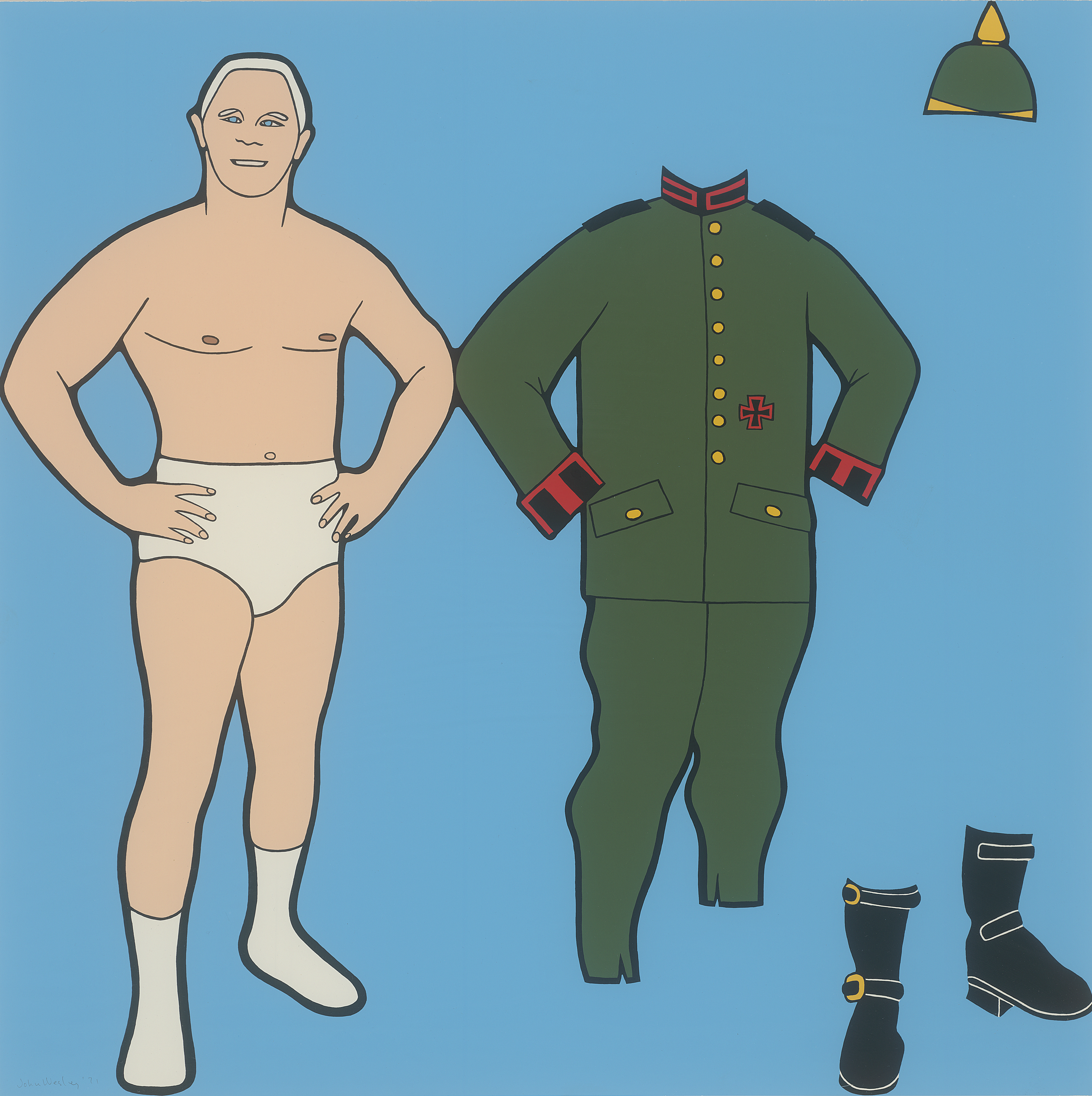 John Wesley gilt als einer der Wegbereiter der Pop Art. Aus der acht Siebdrucke umfassenden Mappe "Panoply: 8 Silkscreen Prints Inspired by the Splendours of The Great War". Gedruckt von Hans-Peter Haas, Stuttgart; herausgegeben von Abrams Original Editions, New York, in einer Gesamtauflage von 125 Exemplaren. Prachtvoller, farbintensiver Druck der formatfüllenden Komposition.