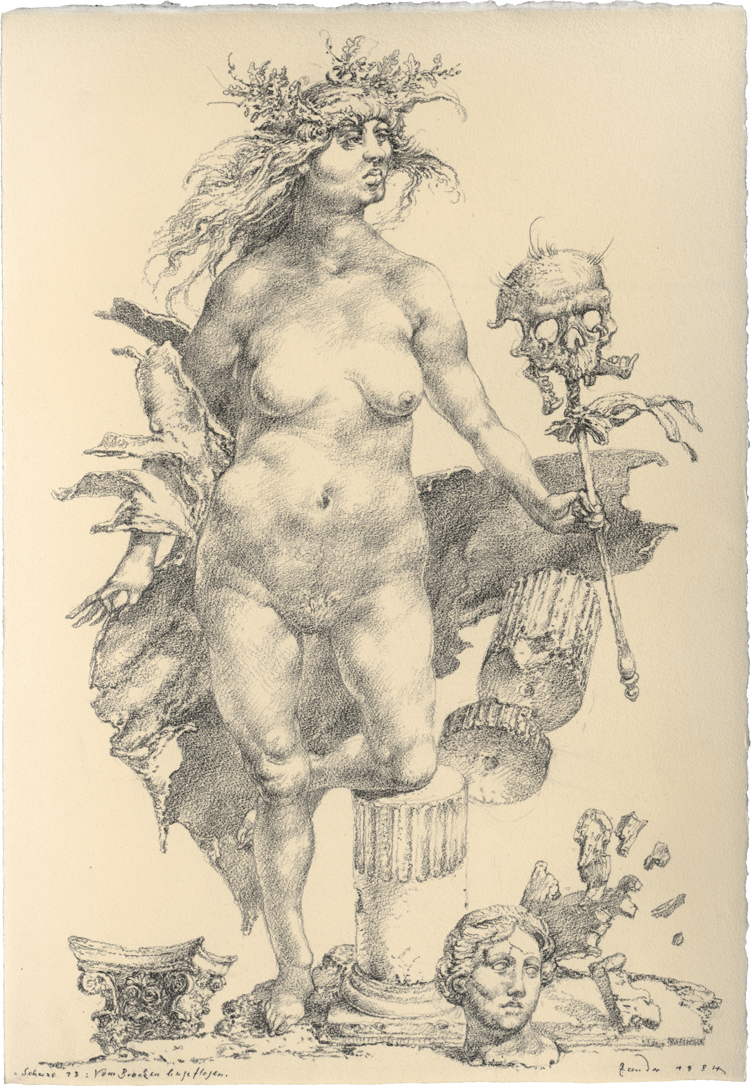 Surrealistische Elemente treffen in Heinz Zanders Werk, wie häufig bei den Künstlern der Leipziger Schule, auf die Gestaltungsweise des italienischen Manierismus. Bröckelnde Ruinen und ein Totenschädel als Vanitassymbole umgeben den im Titel als Hexe gekennzeichneten Frauenakt, der alles um sich herum in wilde Bewegung zu versetzen scheint.