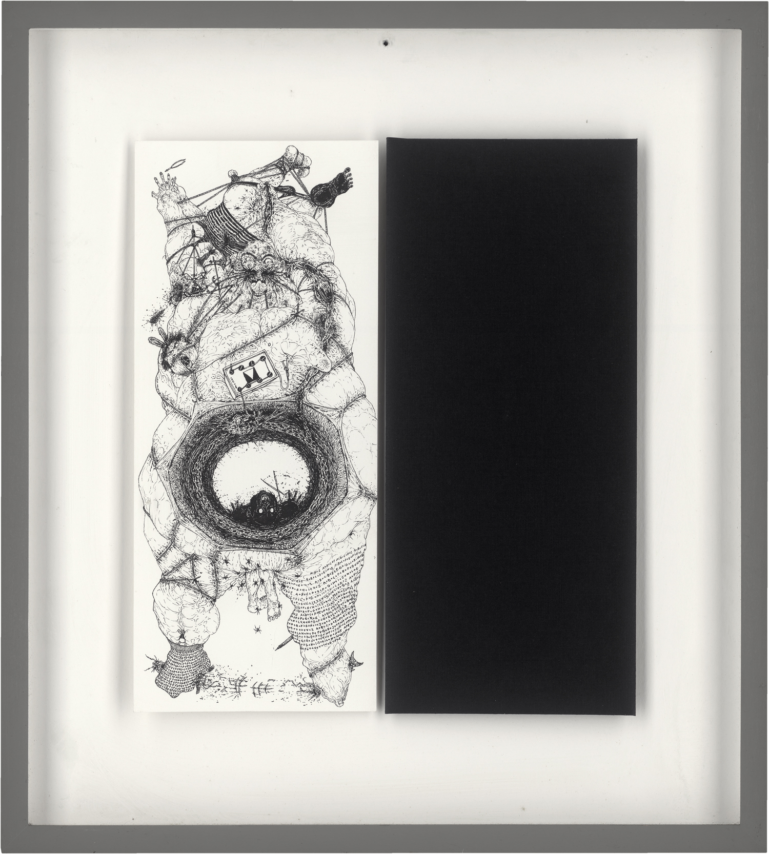 2-teilige Arbeit. Feder bzw. Pinsel in Schwarz auf Velin, in Kastenrahmen montiert. 2007.