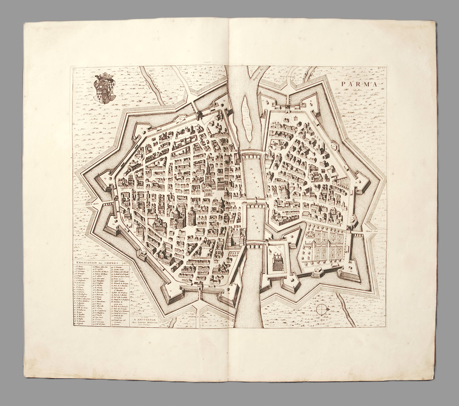Koeman, I, Bl 83. – Ansicht der Stadt Parma aus der Vogelperspektive von Johannes Blaeu (1596-1673) mit Wappen und Legende. – Mit Mittelfalz. Papierbedingt gebräunt und etwas stockfleckig.