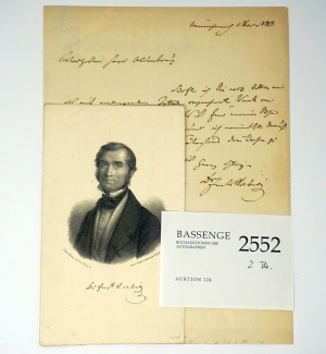 An den Buchhändler Oldenbourg, den er um die Beschaffung eines Buches bittet. "... Es ist für meinen Sohn nach Bombay bestimmt und ich wünschte darauf rechnen zu können es in spätestens drei Wochen zu haben ...". - Liebigs ältester Sohn Georg (1827-1903), ein Mediziner und Klimatologe, war 1853 für die englische Ostindien-Kompanie nach Bombay gereist. 1855 wurde er Professor in Kalkutta. - Ein kleiner Einriss unauffällig unterlegt. - Beiliegend ein Porträt Liebigs, nach einer Zeichnung von Engel lithographiert von d'Artus; mit faksimilierter Signatur noch ohne Adelstitel, also vor 1845.