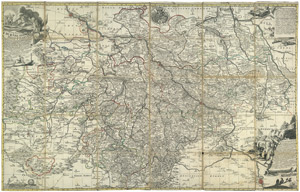 Lotter, Tobias Conrad. Aller Neueste Chursaechsische Post Charte darinnen des Churfürstenthum Sachsen nnd seiner incorporirten Lande, wie auch andere angraenzende vornehmste Vestungen, Stätte, Flecken und notablesten Schlösser, Güther und Dörffer. Genzkolorierte Kupferstichkarte in 30 Kompartimente geteilt und auf Gaze aufgezogen. 68 x 106 cm. Augsburg, Lotter, 1760.