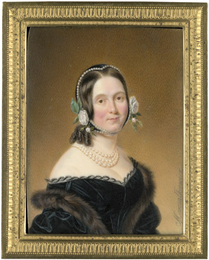 (1789-1872, Warschau)Bildnis einer jungen Frau mit perlenbesetzter schwarzer Tudor-Stil Haube geschmückt mit weißen Rosen, in schulterfreiem und spitzenbesetztem schwarzem Kleid mit Pelzboa, eine dreireihige Perlenkette um dem Hals