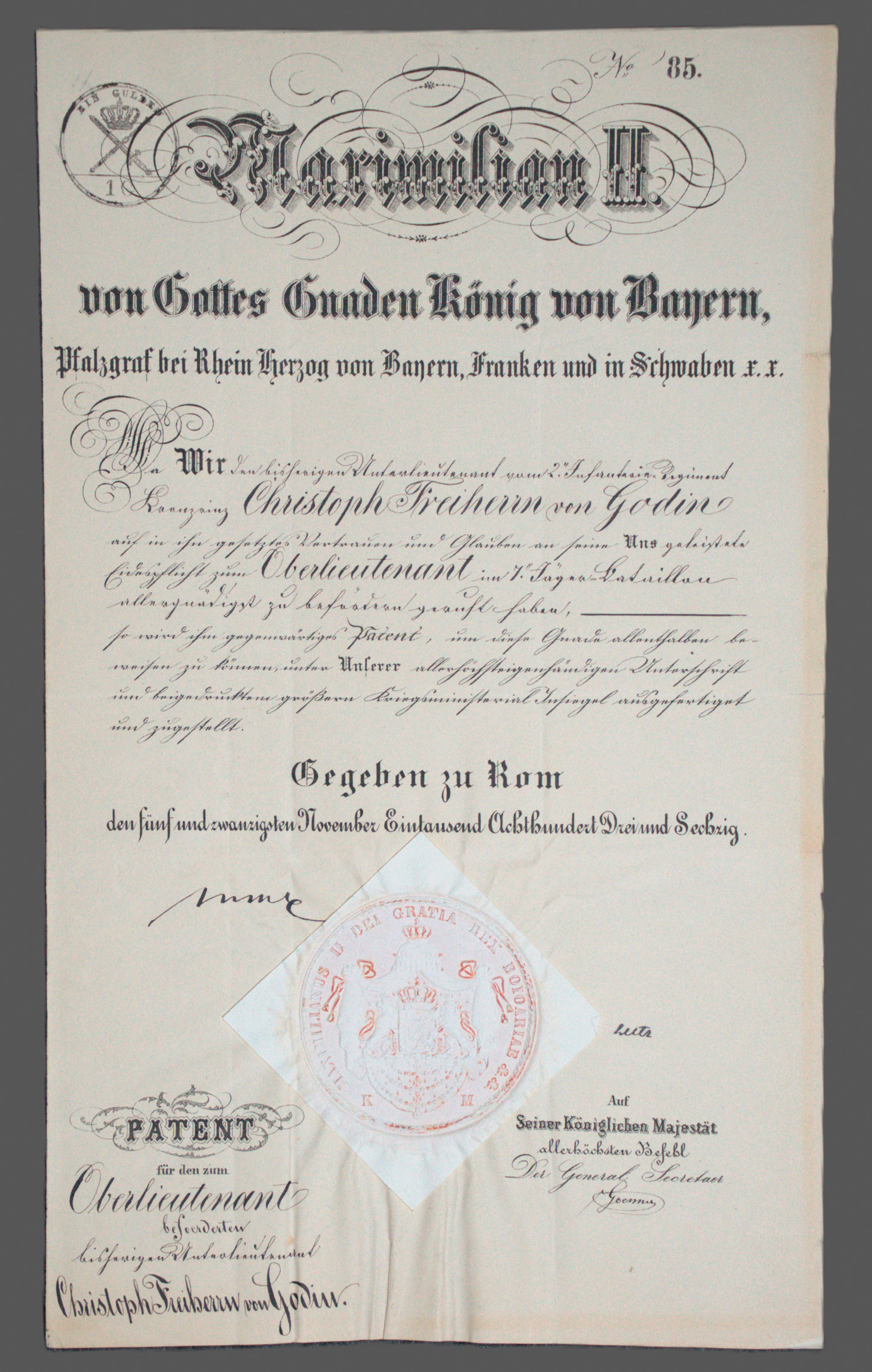 (1811-1869)Urkunde: Patent als Oberleutnant für den Freiherrn von Godin.1863.