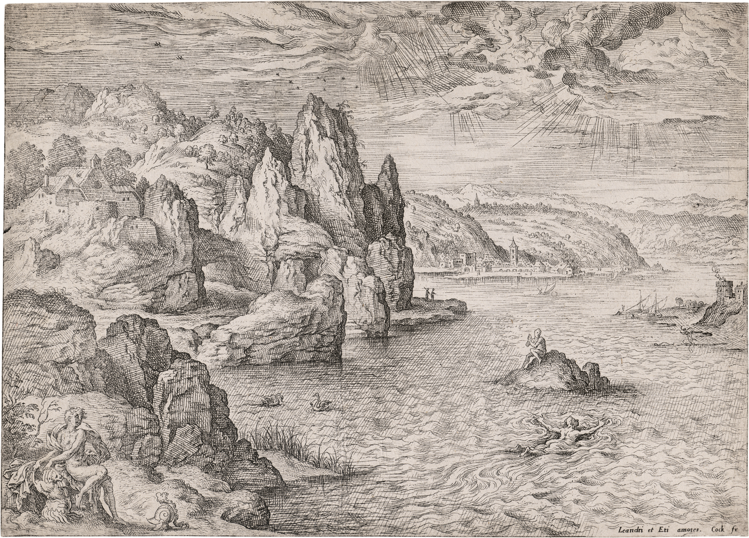 (1510-1570, Antwerpen)Landschaft mit Leander, der durch den Hellespont schwimmt