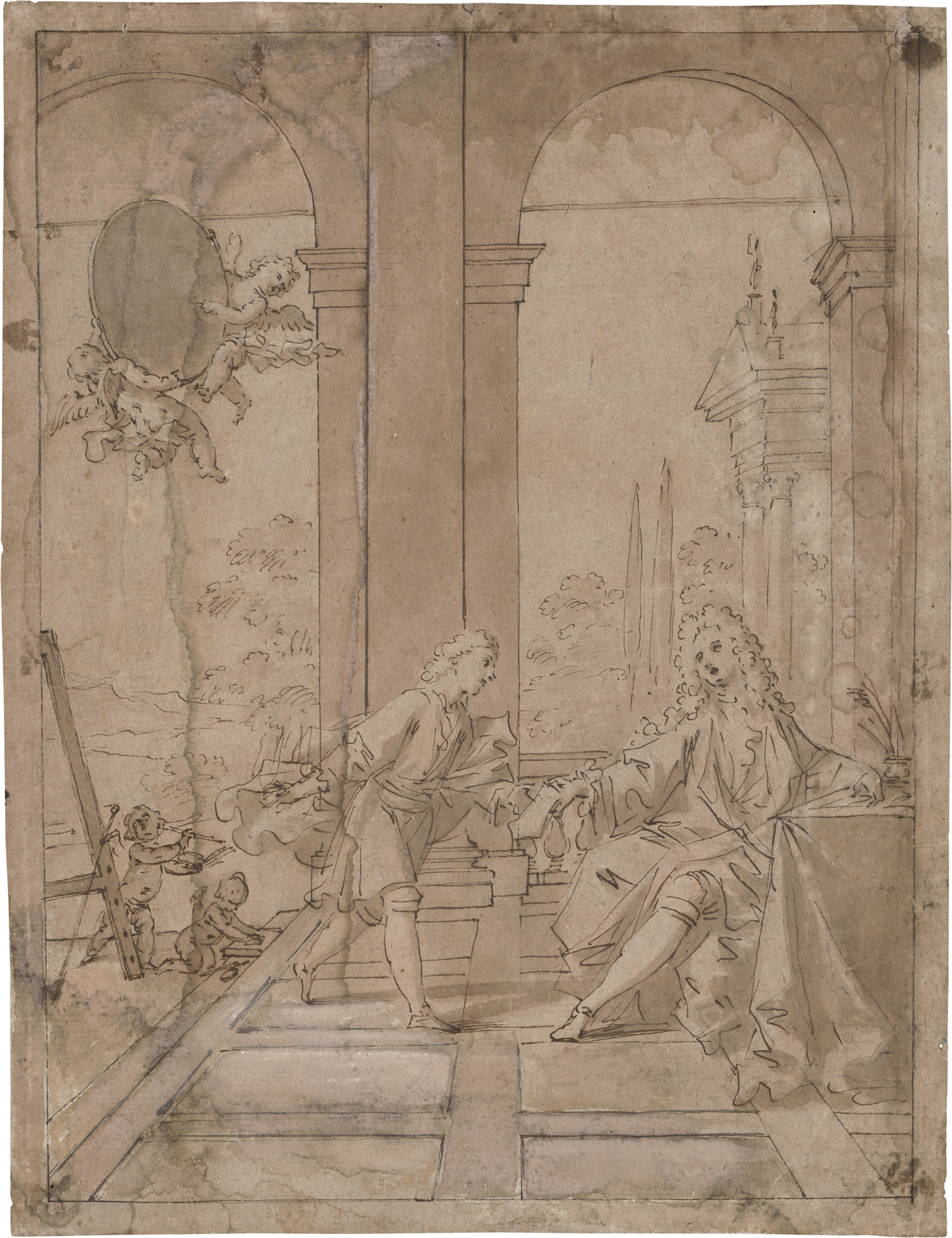 um 1690. Allegorie auf die Auftragsmalerei (Ein Maler nimmt einen Auftrag entgegen)