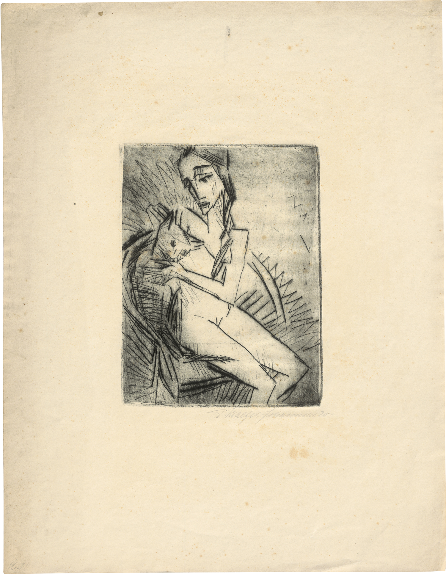 (1886 Lehnsahn - 1930 Hamburg)Frau mit Katze in Lehnstuhl