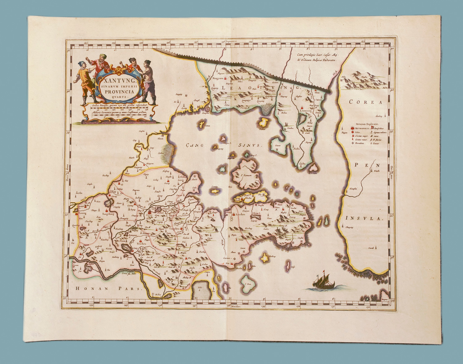 Dargestellt ist der Nordosten Chinas und Korea von Johannes Blaeu (1596-1673). Mit figürlicher Titelkartusche und einer Legende. – Mit Mittelfalz, mit winzigen kleinen Braunfleckchen.