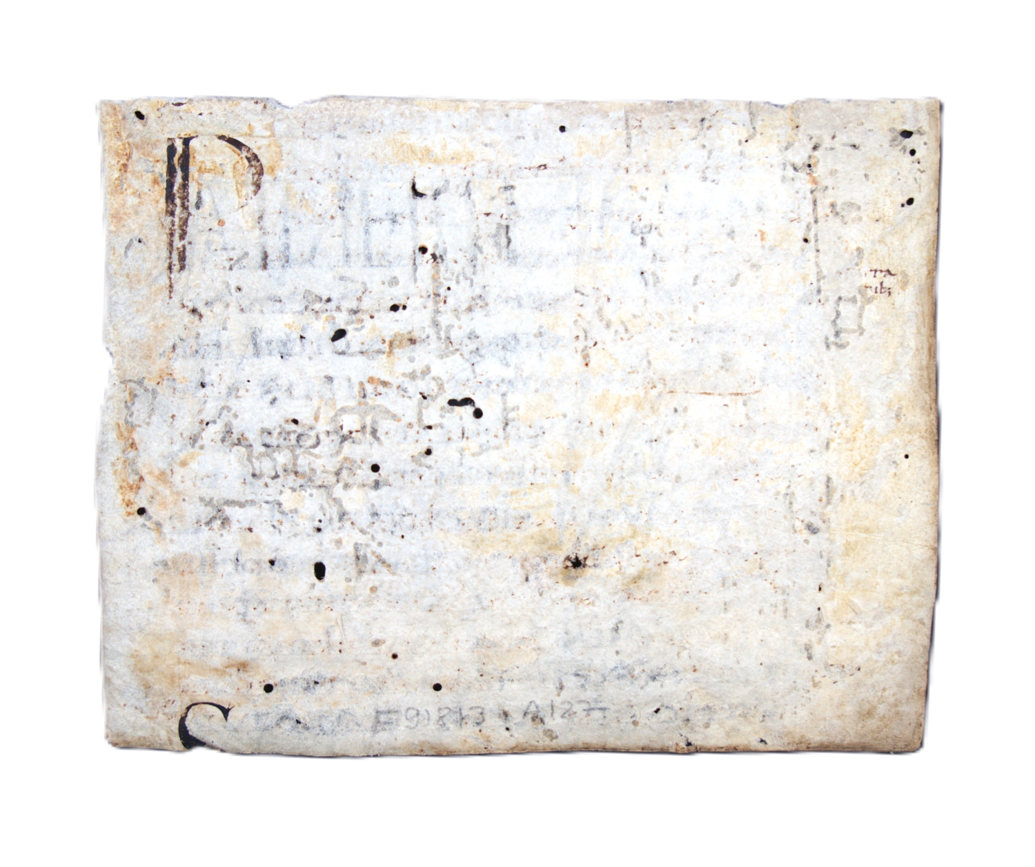 Auch die R-Initiale könnte auf einer Entstehung der Handschrift in Norditalien verweisen. Die Abkürzung für 'autem' in der vorletzten Zeile ist ursprünglich irisch oder angelsächsisch, wurde jedoch im Frühmittelalter auch in insular beeinflussten Scriptorien auf dem europäischen Festland verwendet. Die Transliteration der griechischen Wörter ist nahezu perfekt; die Verwendung von Versalien in der 1. Zeile ist enigmatisch. Unleserliche Spuren und Reste einer Beschriftung auf der Rückseite.