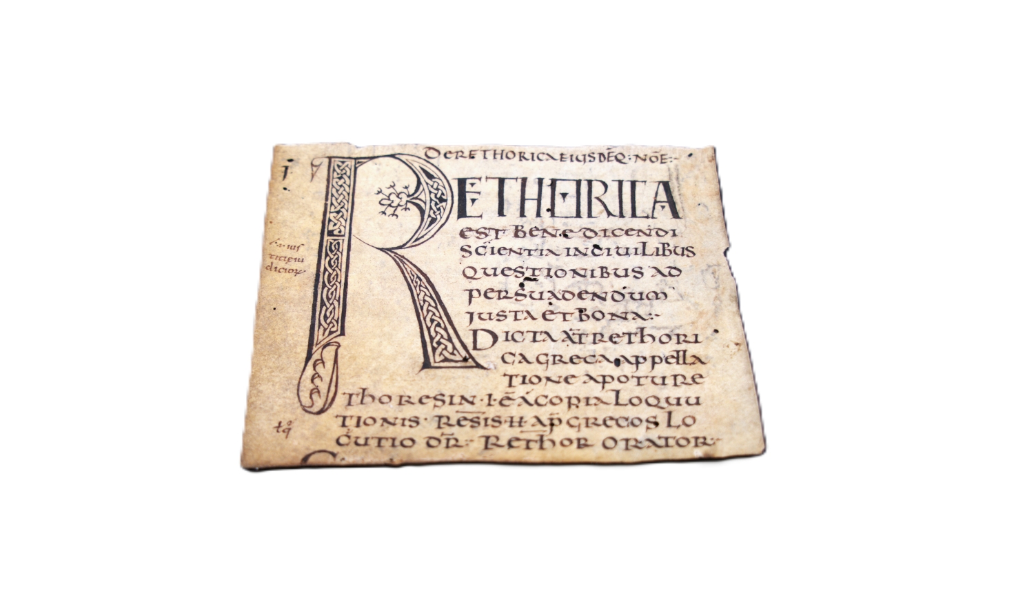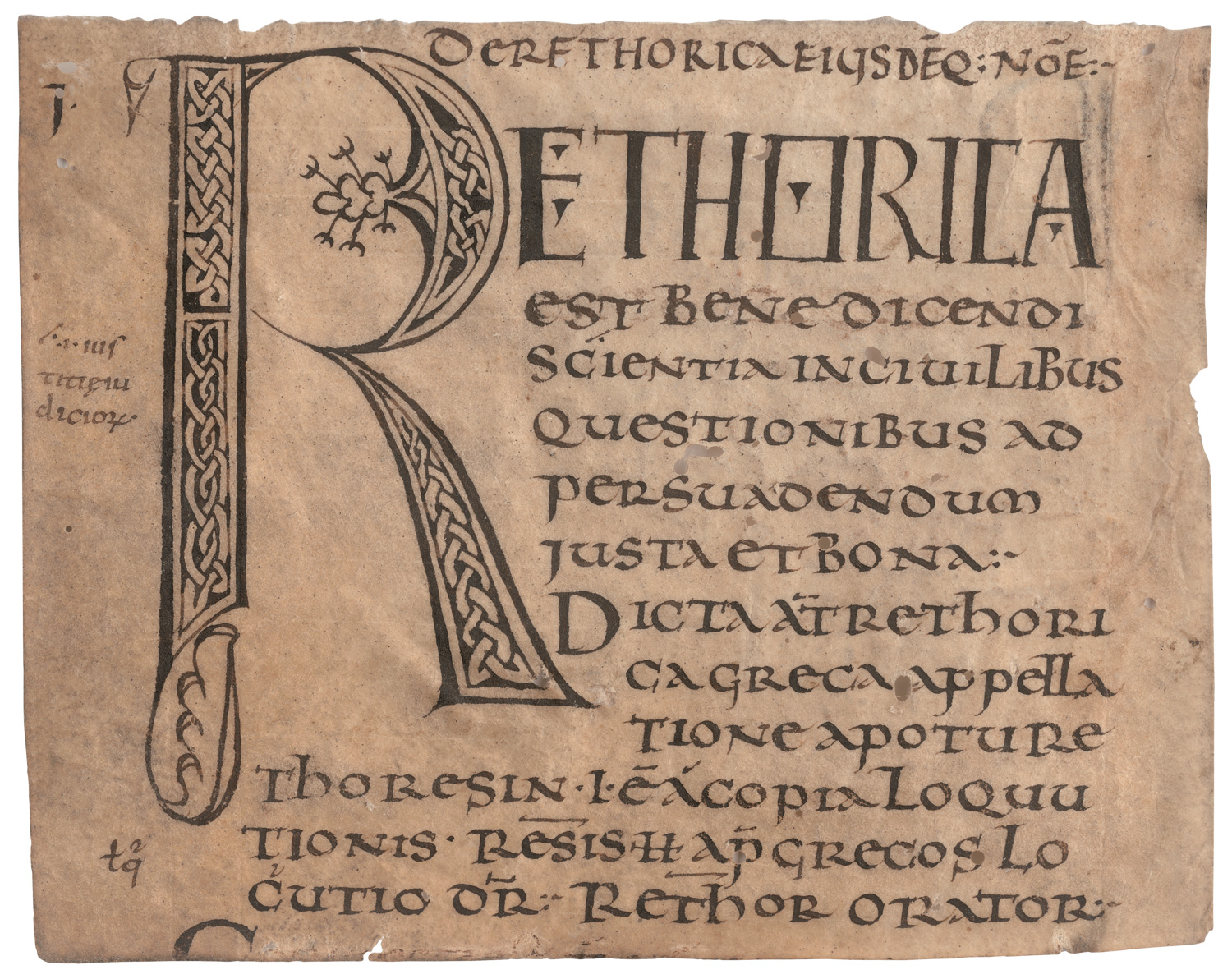 Rhetorica. "De rethorica eiusdemque nomen". Incipit-Fragment einer lateinischen Handschrift auf Pergament. 1 Blatt, 1 Seite. 13 Zeilen. Schriftraum ca. 10,2 x 11 cm. Blattgröße 10,6 x 13,6 cm. Unziale in braunschwarzer Tinte. Mit 15-zeiligen Feder- und Flechtwerkinitiale "R" in braunschwarzer Tinte. Wohl Norditalien erste Hälfte des 8. Jahrhunderts.