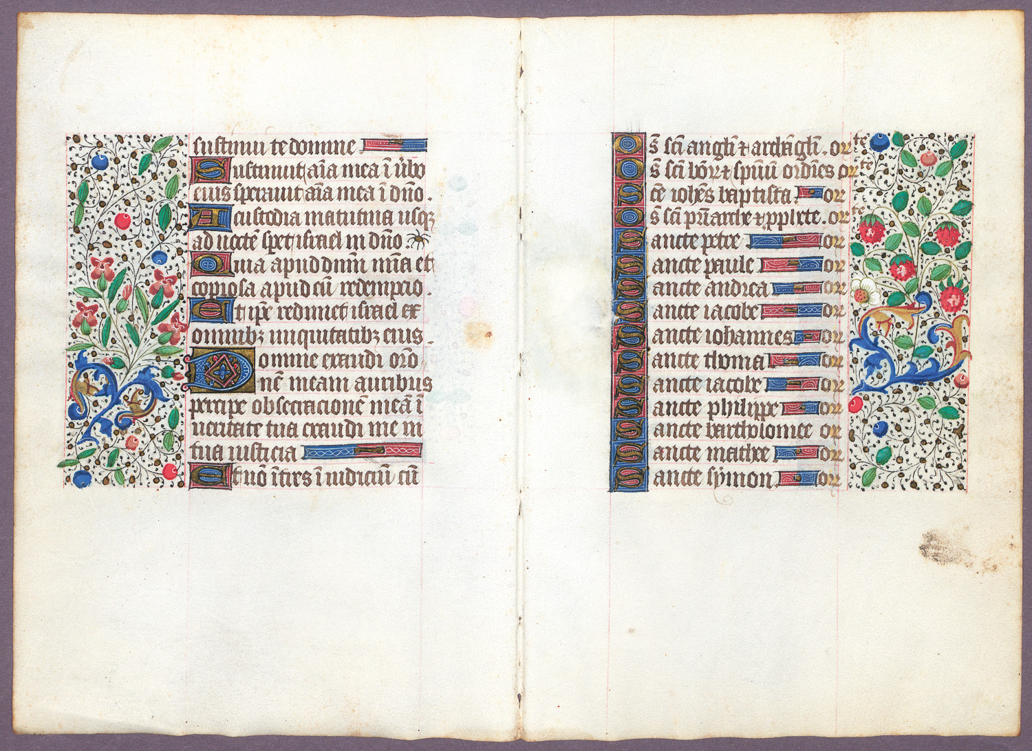 Aus einem besonders üppig ausgestatteten Stundenbuch: Die leuchtenden Goldinitialen akzentuieren die saubere Textur des biblischen Worte und Heiligenlitaneien und finden einen glänzenden Widerpart in den blitzenden Goldpunkten der breiten Außenstegbordüren, die gefüllt sind mit bunten Blumen und Früchten, Margeriten, Hagebutten, Rosen, Passions- und Fächerblumen, Distelblüten, Blaubeeren oder dicken Erdbeeren. – In sehr guter Erhaltung, erstaunlich breitrandig und in leuchtendem Blattgold - ein authentisches Stück des leuchtenden Mittelalters.