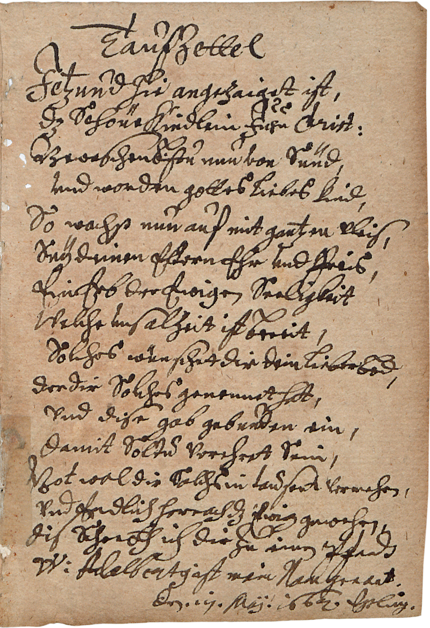 Der zweite Text (Fol 6, 7r), datiert 1662 in schwarzer Tinte hinzugefügt worden, offenbar war das kleine Heft bis dahin in Gebrauch. Es enthält einen "Taufzettel", datiert "den iij. May 1662" mit einem Taufmahngedicht, ebenfalls in deutscher Sprache, gereimt in 8 Versen zu 16 Zeilen: "Jetz und hir angezaiget ist / daz schöne kindlein Jesu Christ / Bevreyt bist du nun von Sünd / und von den gottes Liebes Kind / So wachs nun auf mit gutem vleis, Sey deinen eltern ehr und preis / ein erb der frohen Seligkeit / Welche hier allzeit ist bereit ..." (ungefähre Lesart mit Fehlern).