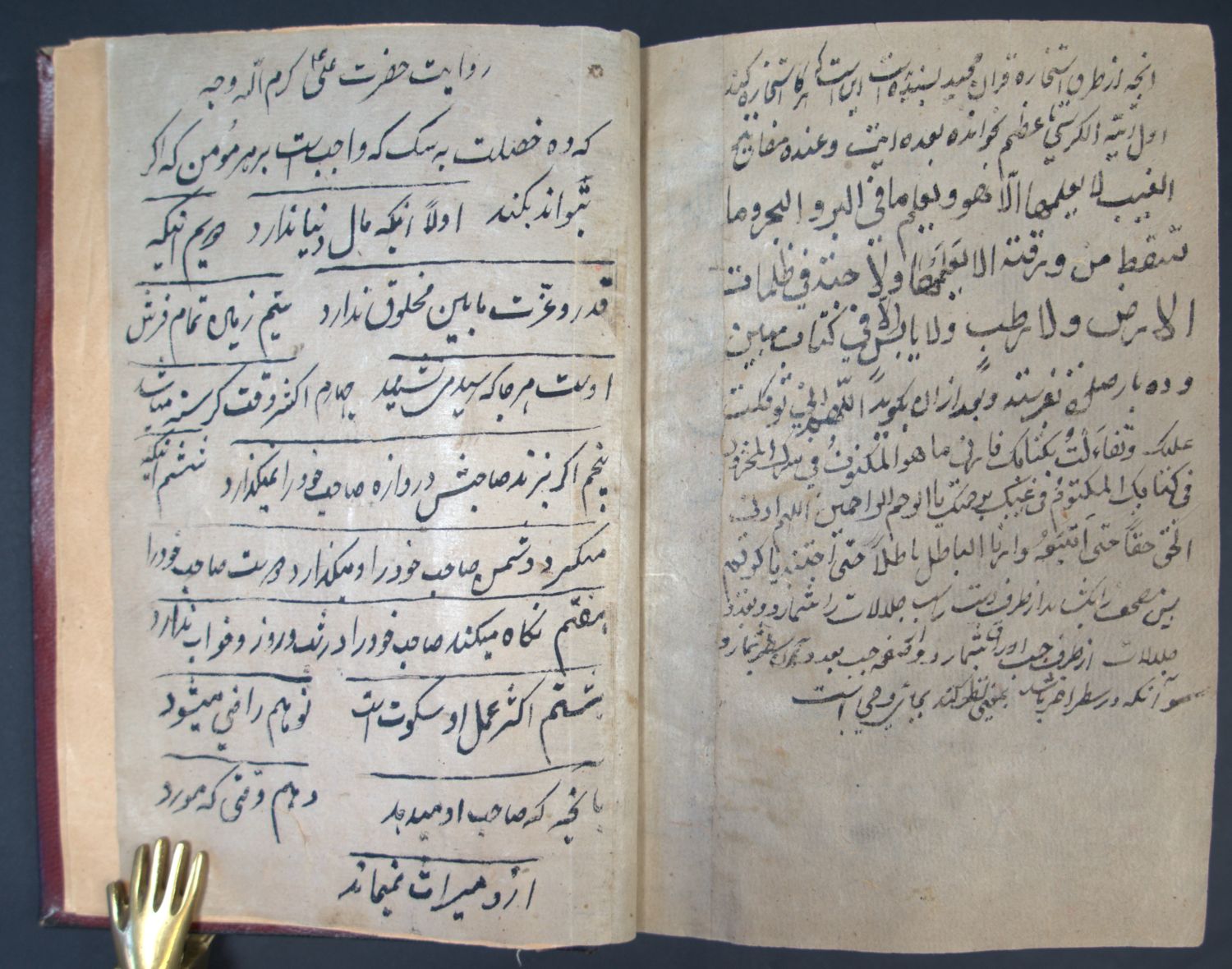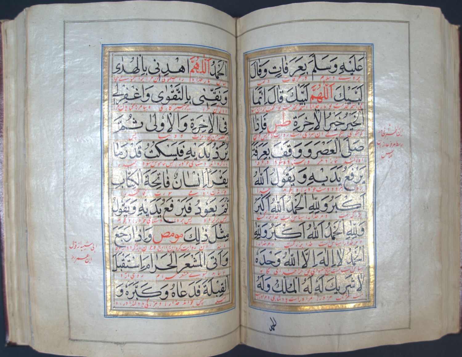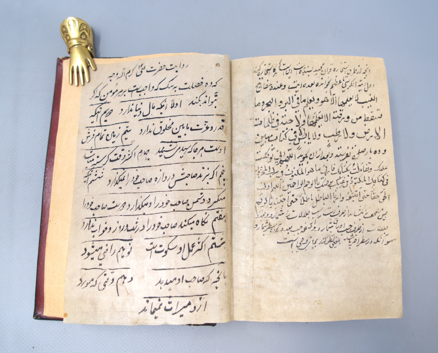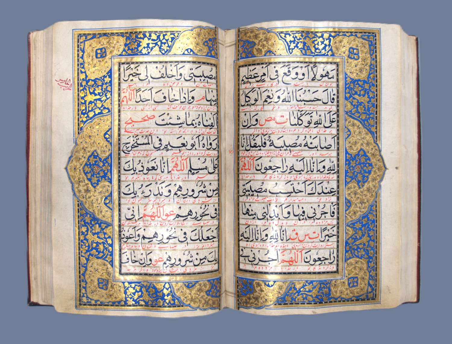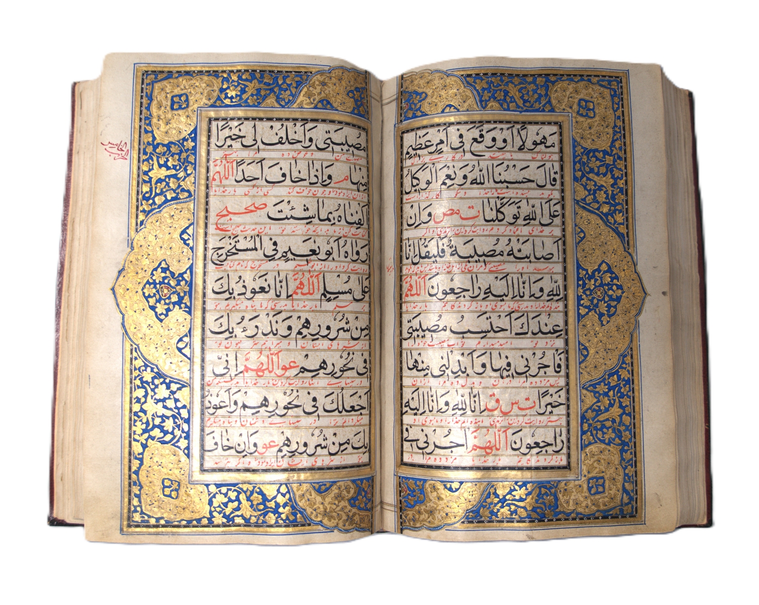 Während der mystisch-heiligen Urtexte in hoher aufrecht gezogener, minimal nach links kippender schwarzen Kalligraphie im Naskhi-Duktus und mit Auszeichnungen in Rot, etwa für den Gottesnamen "Allah", "Der Mächtigste", "Der Allerbarmer" etc., geschrieben wurde, sind in den schmaleren Zeilen dazwischen - jeweils unter dem arabischen Urtext - Übersetzungen in Farsi im Nastaliq-Duktus. Die Textanlage mit den interlinearen Übersetzungen ist typisch für die Koranschulen und Schreiberwerkstätten in Isfahan oder Shiraz, teils auch in Teheran, in der Übergangszeit vom späten Safawiden- zum Qajar-Reich (18. und 19. Jahrhundert). Die Künstler der Kitabkhana (Werkstätten bzw. Schreiberateliers) zeichneten sich nicht nur durch eine Rückbesinnung auf klassische Stile, sondern auch durch neue, phantasievolle Ornamente aus, die ganz besonders minutiös und nuanciert ausgearbeitet waren, so daß Koran- und Gebetshandschriften entstanden, die für die reiche Mittel- und Oberschicht, den Hof und wohlhabende Händler gedacht waren. – Nur leichte Handhabungsspuren, der erste Ziertitel mit kleinen Knitterspuren und sauberer Randansetzung, sonst kaum Randläsuren, gelegentlich etwas stock- und braunfleckig. Vorsätze mit arabischen Annotationen von alter Hand. Vereinzelt auch im Textblock Randkommentare in Rot. Mit wenigen hinterlegten Randläsuren und kleinen Randausbrüchen. Insgesamt altersgemäß in herausragend gutem Zustand.