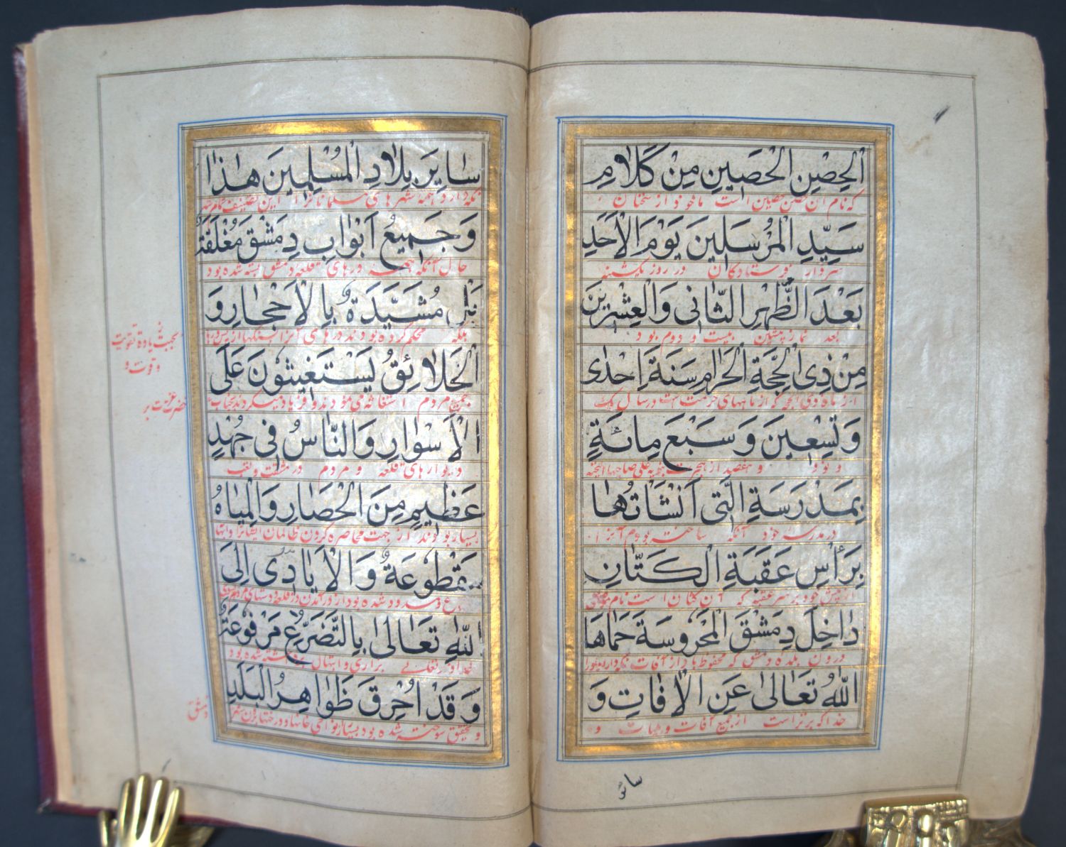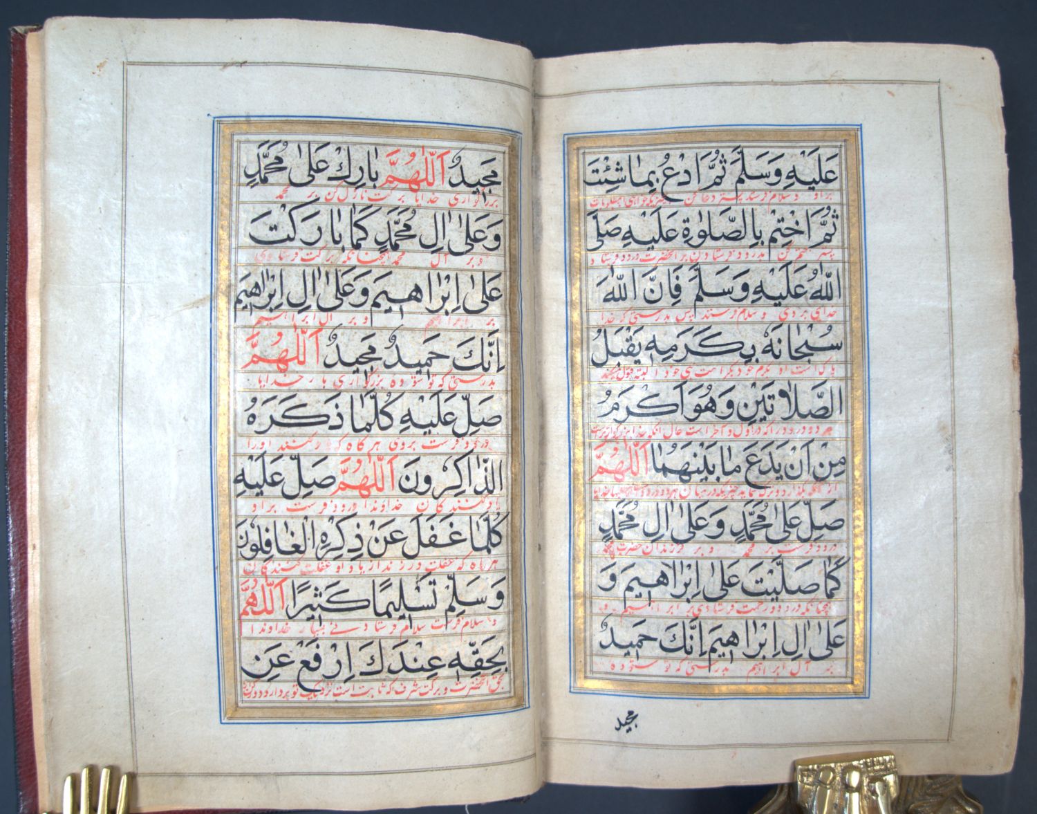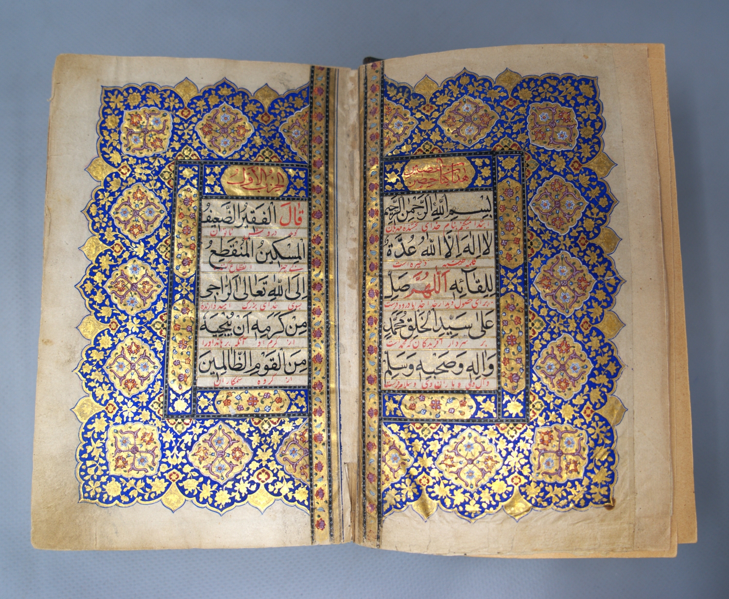 Ibn al-Dschazari (auch: Ibn al-Jazari bzw. Ibn-al-Gazari, Muhammad Ibn-Muhammad). Kitab al-hisn al-hasin min kalam saiyid al-mursalin (arabice: Abhandlung über Zeiten und Gelegenheiten zum Gebet für den Propheten Muhammad, zusammengestellt nach Traditionswerken). Persische Handschrift mit prachtvoller Illumination auf gelatiniertem Büttenpapier. 298 nn. Bl. 9 Zeilen mit den Versen in schwarzer Naskhi-Schrift und interlinearer Farsi-Übersetzung in Nastaliq-Duktus. Jede Seite mit breitem Goldrahmen in vielfachem schwarzen und blauem Lineament, Zeilentrennern in goldgefülltem Doppellineament, Auszeichnungen in roter Tinte und 7 besonders reich vergoldeten Doppelzierseiten Sar-lauh im Stil der typischen Carpet Pages in Lapislazuli-Blau mit breiter Rahmenornamentik in Blattgold, Lapisblau und teils mit Goldblumen und floralen Elementen in Hellblau, Rot, Orange und Grün. Schriftraum: 13,2 x 6,5 cm. Format: 19 x 12,5 cm. Schlichter schwarzbrauner Lederband des 19. Jahrhunderts (stärker berieben und beschabt, teils überarbeitet bzw. alt restauriert) mit goldgeprägten Deckelfileten (diese ebenfalls berieben). Persien (Shiraz, Isfahan?) 18. Jahrhundert.