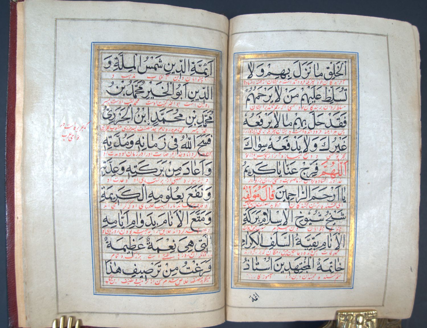Besonders schöne, kostbar illuminierte Handschrift mit sieben doppelblattgroßen Zierseiten "Sar-lauh", sogenannten "Carpet Pages", die den Text mit besonders üppigen, breiten Bordüren einfassen. Es handelt sich um das Hauptwerk des Korangelehrten Ibn al-Dschazari (1350-1429), eine Zusammenstellung aus den bedeutendsten Koranrezitatoren bis zum 15. Jahrhundert mit mystischen Gebeten und Erbauungstexten. Ibn al-Dschazari schrieb über die Auslegung von Hadithen und Fiqh, islamische Rechtswissenschaft, Geschichte und die arabische Sprache, aber eben auch über die Deutungsmöglichkeiten des Koran.
