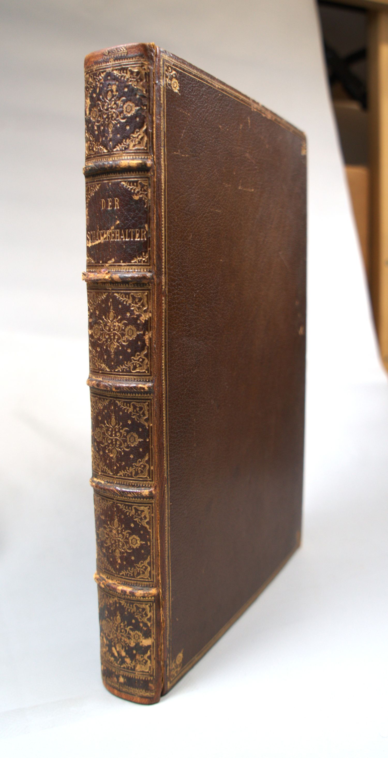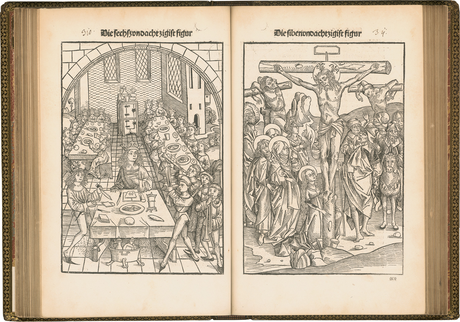 Fridolin, Stephan. Schatzbehalter oder Schrein der wahren Reichtümer des Heils und ewiger Seligkeit. 353 (statt 354) nn. Bl. (ohne das letzte weiße). 2 Spalten. 40-43 Zeilen. Got. Typ. Schriftraum: 33,3 x 23,3 cm. Format: 31,5 x 21,8 cm. Mit 96 (5 wdhl.) ganzseitigen Textholzschnitten von Michael Wolgemut und Wilhelm Pleydenwurff. Dunkelbraues Maroquin um 1880 (nur leichte Bestoßungen und Bereibungen, wenige Kratzer und Druckstellen, Gelenke etwas brüchig) über 5 Zierbünden mit goldgeprägtem RTitel und reicher RVergoldung, doppelten Deckelgoldfileten mit Dentelles und Eckfleurons, Stehkantenpunktierung und reicher Innenkantenvergoldung sowie Vorsätzen aus türkischem Marmorpapier, dreiseitiger Goldschnitt, in modernem Schuber aus dunkelbraunem Kalbsleder. Nürnberg, Anton Koberger, 18. XI. 1491.