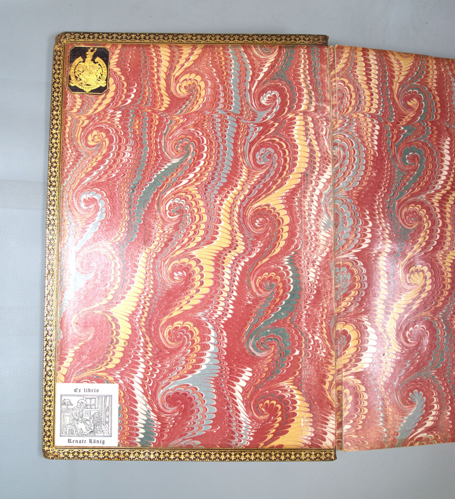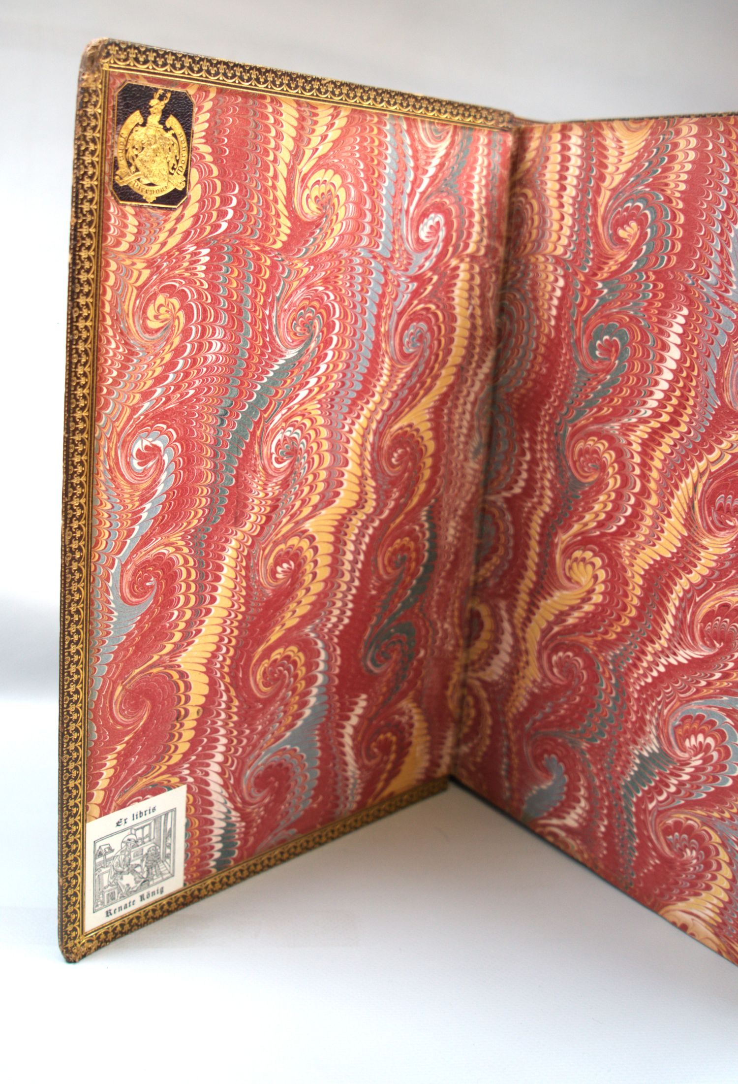 Großartiges Exemplar und das letzte wohl noch im Handel befindliche aus exzellenter Provenienz: Der "Fridolin" stammt aus der Sammlung des Bibliophilen amerikanischer Unternehmers und bedeutendsten Privatbankiers seiner Zeit, John Pierpont Morgan (1837-1913), mit dessen goldgeprägtem Lederexlibris auf dem Vorsatz oben. Auf dem ersten weißen Blatt verso ein umrissbeschnittenes Holzschnitt-Wappen, wohl das Bücherzeichen des Wilhelm von Zell, der um oder nach 1500 nachweisbar ist mit einer Schenkung von Büchern an die Kartause Buxheim. Auf dem Vorsatz unten dann ein weiteres Exlibris der Kunstsammlerin und Mäzenin Renate König (1928-2024).