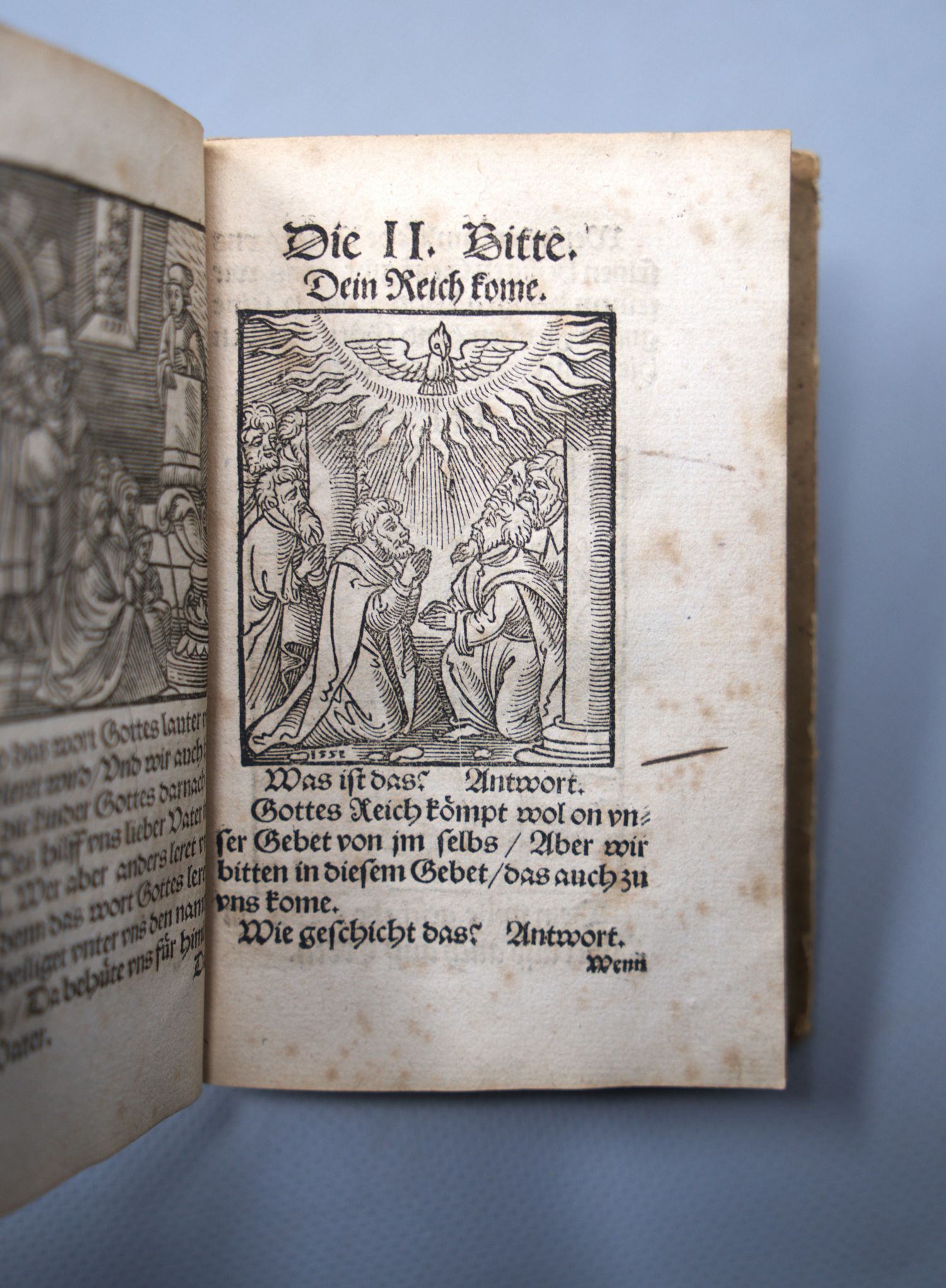 Luther, Martin. Enchiridion. Der kleine Catechismus für die gemeine Pfarrherr und Prediger. Auffs newe ubersehen und zugerichtet. 71 Bl. Titel in Schwarz und Rot. 71 Bl. (statt 72?). Mit Holzschnitt-Portraimedaillon und 25 nahezu ganzseitigen Textholzschnitten. 14,5 x 9,5 cm. Pappband des frühen 19. Jahrhunderts (stärker fleckig und berieben, Ecken bestoßen, Rückenbezug mt Fehlstelle). Wittenberg, o. Dr. u. J. (um 1560).