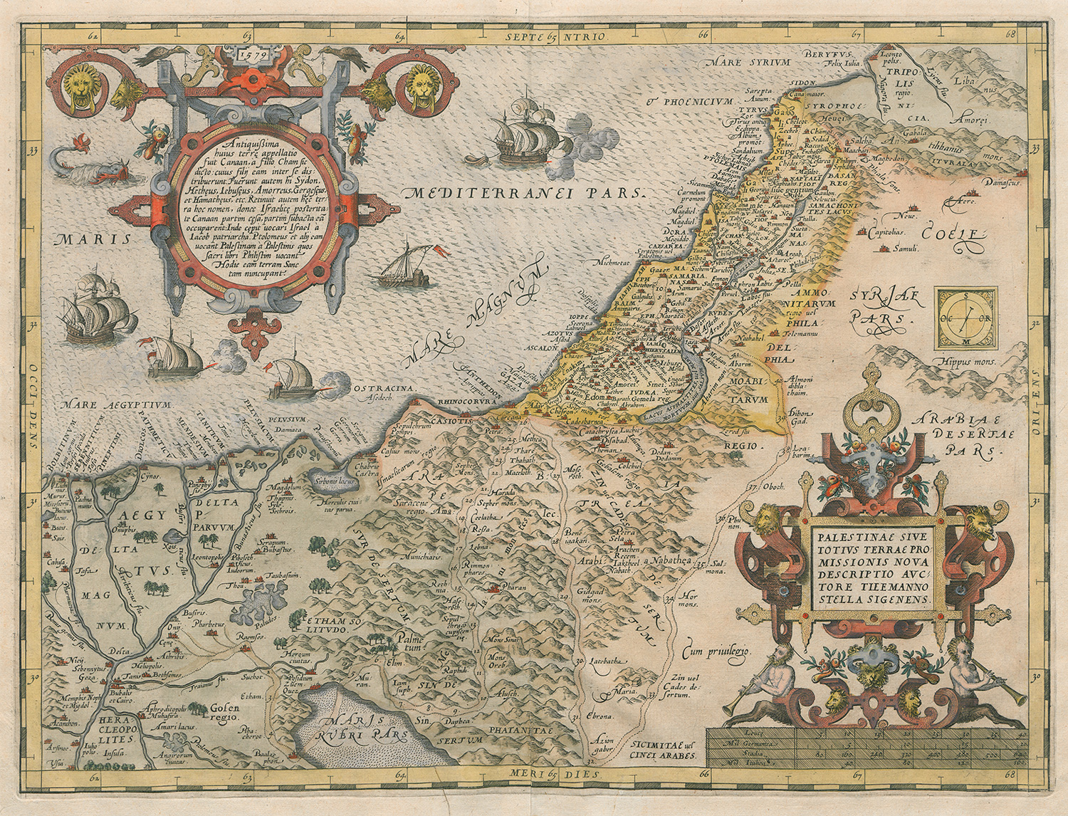 Ortelius, Abraham. Palestinae sive totius terrae promissionis nova descriptio auctore tilemanno stella sigenens. Kolorierte Kupferkarte. 34,5 x 46,5 cm. Um 1579.