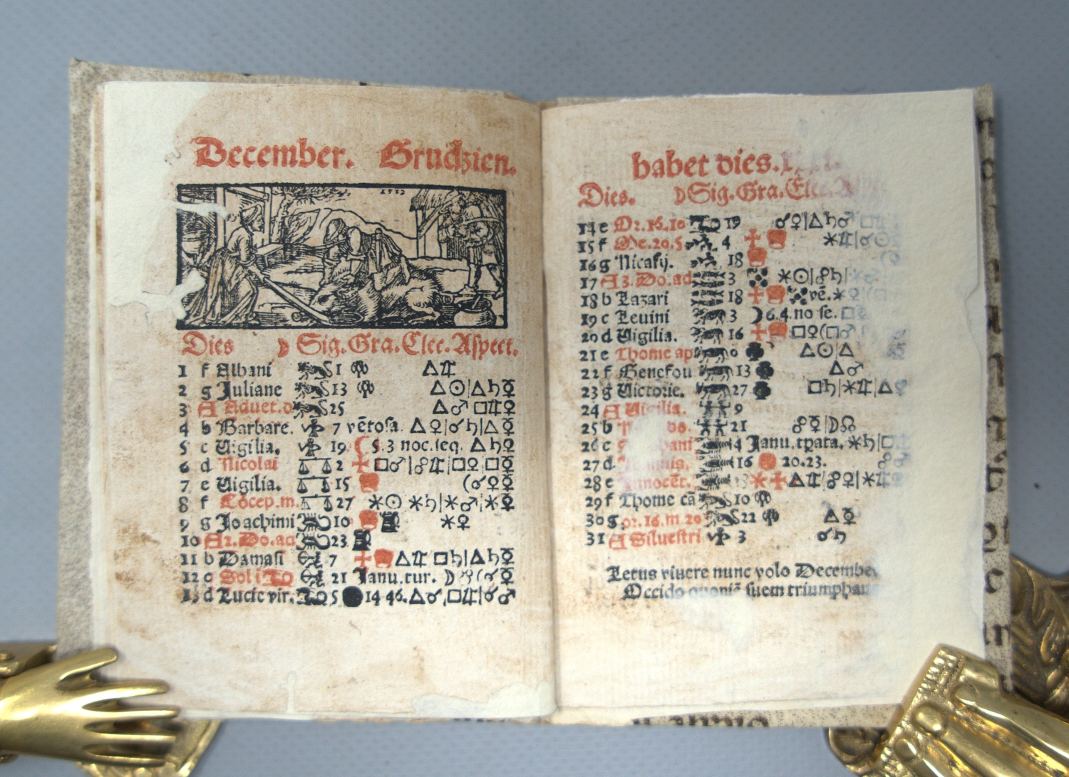 Hübsches kleines Kalendarium mit dem Titel "Ephemeridiarium", einer Zusammensetzung aus "Ephemerides" (Zeitberechnung auf Basis der Positionsbestimmungen von Himmelskörpern) und und "Diarium" (Kalender mit Mondphasen, Zodiakus etc.). Nach der "Configurationum Lune cum Sole et planetis ennaratio" folgen die Monate in lateinische und polnischer Sprache "Januarius. Styczeń. habet dies.xxxi.", "Februarius. Luty. habet dies.xxix." etc. Die kleinen Querholzschnitte zeigen typische, den Jahreszeiten zugeordnete Szenen wie Eggen, Aussaat, Mähnen, Pflügen, Weinkeltern, Jagd und winterliches Festmahl. Darunter jeweils der Heiligenkalender mit den prominenten Heiligen der römisch-katholischen Kirche, aber auch vielen polnischen Lokalheiligen wie dem Heiligen Adalbert von Prag (23. April), Stanislaus von Krakau (8. Mai) etc.