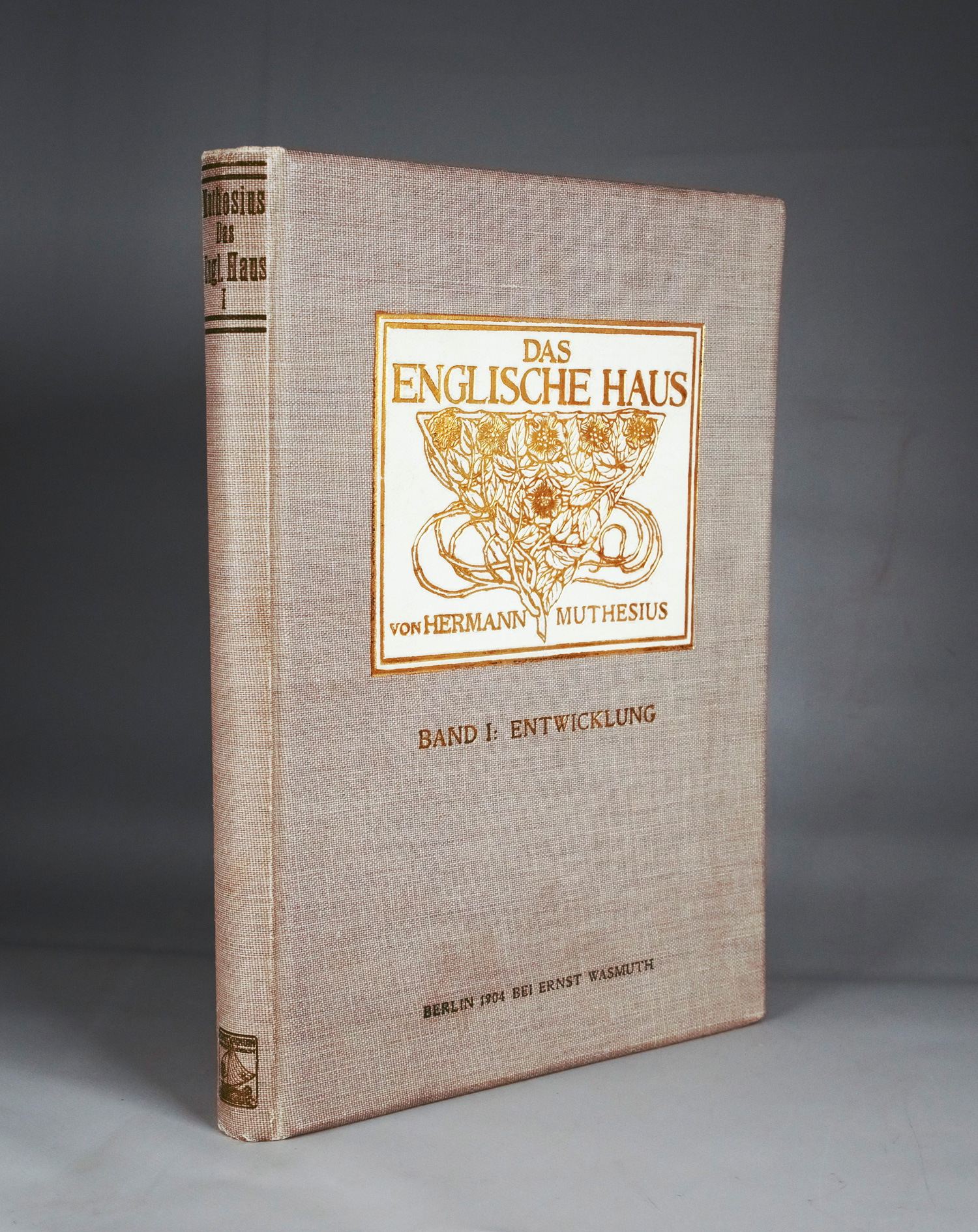 Muthesius, Hermann. Das englische Haus. Entwicklung, Bedingungen, Anlage, Aufbau, Einrichtung und Innenraum. 3 Bde. Mit zahlreichen Textabbildungen, Plänen und Skizzen. 31,5 x 22 cm. OLeinenbände mit goldgepr. Deckelillustration. Berlin, E. Wasmuth, 1904.