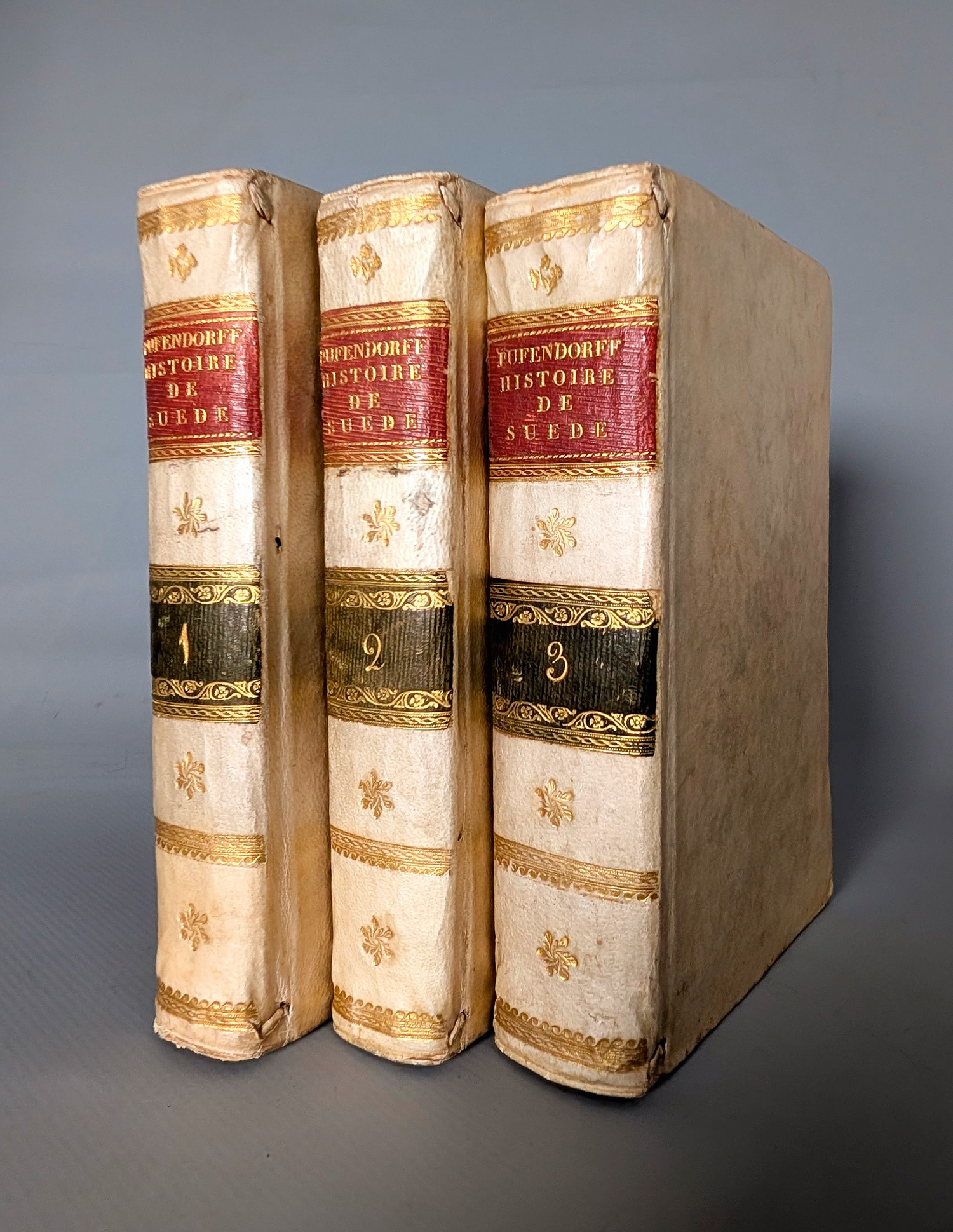 Pufendorf, Samuel von. Histoire de Suede, avant et depuis la fondation de la Monarchie. Nouvelle Edition. 3 Bände. Mit Kupfertitel (in Band II), 2 gestochenen Portraits und gestochener Titelvignette. 17 x 10 cm. Pergament d. Z. (gering fleckig und berieben) mit ornamentaler RVergoldung und je 2 farbigen goldgeprägten RSchildern. Amsterdam, Zacharias Chatelain, 1748.