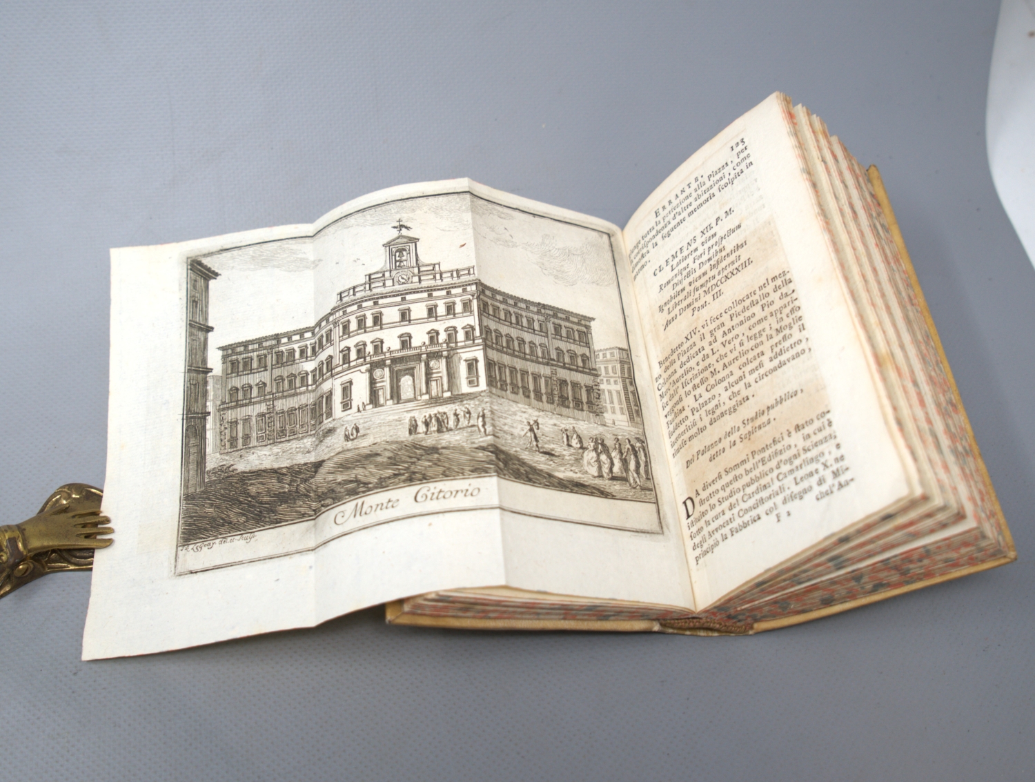 Rossini, Pietro. Il mercurio errante delle grandezze di Roma. Ottava edizione migliorato. 2 Teile in 1 Band. 6 Bl., 236 S.; 1 Bl., S, 237-418. Mit 18 Faltkupfern von G. B. Piranesi, J. L. Le Geay und F. P. Duflos. 15,5 x 8,5 cm. Pergament d. Z. (Deckel schwach geworfen). Rom, Generoso Salomoni für Fausto Amidei, 1760.