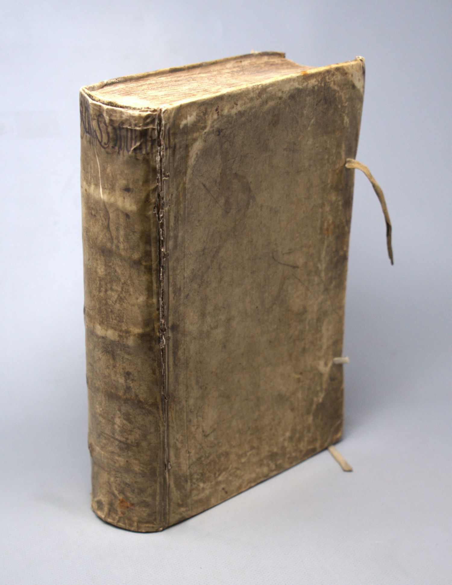 Strada à Rosenberg, Octavius de. Newe Keyser Chronick: Das ist, Wahrhaffte und vollkommene Beschreibung aller Römischen Keyser. Beneben Beschreibung ihrer aller, auch ihrer Gemahlinnen und Kinder Leben. Nunmehr aber biß auff gegenwertige Zeit also den Monat Aug. 1628 vollnführet und continuirt. 4 (statt 5) Bl. 596 S., 6 Bl. (l. w.). Mit szenischer gestochener Titelbordüre, Wappenkupfer und rund 570 Münzkupfern im Text. 29,5 x 19 cm. Pergament d. Z. (stärker fleckig und berieben, vorderes Gelenk geplatzt, mit hs. RTitel, Schließbänder teils lädiert). Frankfurt, Eberhard Kieser, 1629.