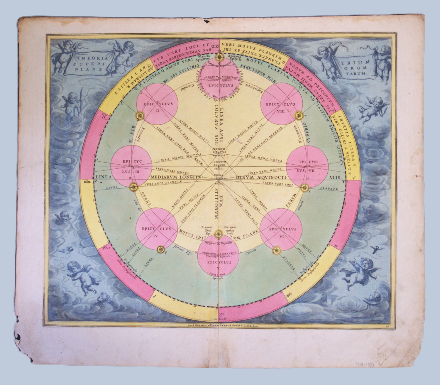 Aus dem Atlas Coelestis seu Harmonia Macrocosmica, dem ersten in den Niederlanden erschienenen Himmelsatlas. Andreas Cellarius (1596-1665) vereinte hierin die kosmologischen Systeme von Ptolemäus, Kopernikus und Tycho Brahe. – Starke Randschäden und -Läsuren, teils mit Einrissen und Wasserflecken. Die Darstellungen selbst überwiegend gut erhalten und im schönem, kräftigem Kolorit.