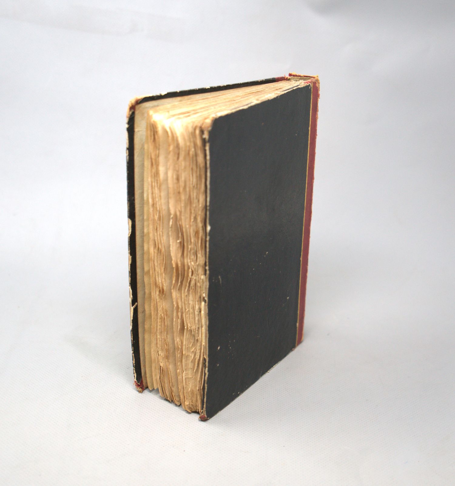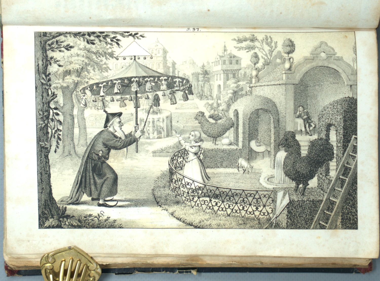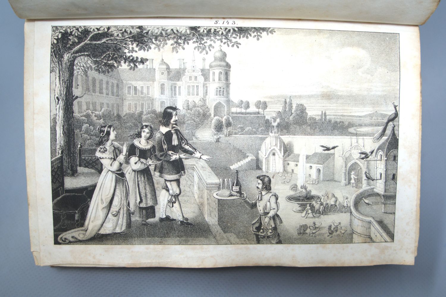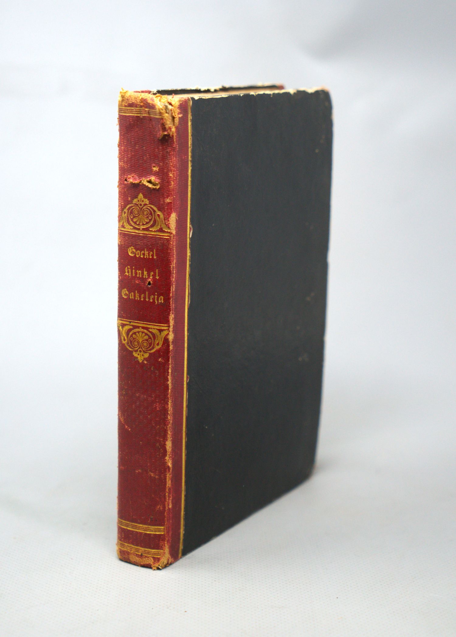 Brentano, Clemens. Gockel, Hinkel und Gackeleia, ein Mährchen. XIV, 346 S. Mit lithographischem Titel und 14 getönten lithographischen Tafeln nach Brentanos Angaben und Entwürfen. 2,5 x 14 cm. Roter Halblederband d. Z. (berieben und bestoßen, obereres Kapital mit Einriss, Rückenbezug mit 3 Löchern; mit montiertem typographischem ORückumschlag ) mit RVergoldung und goldgeprägtem RTitel. Frankfurt, Schmerber, 1838.