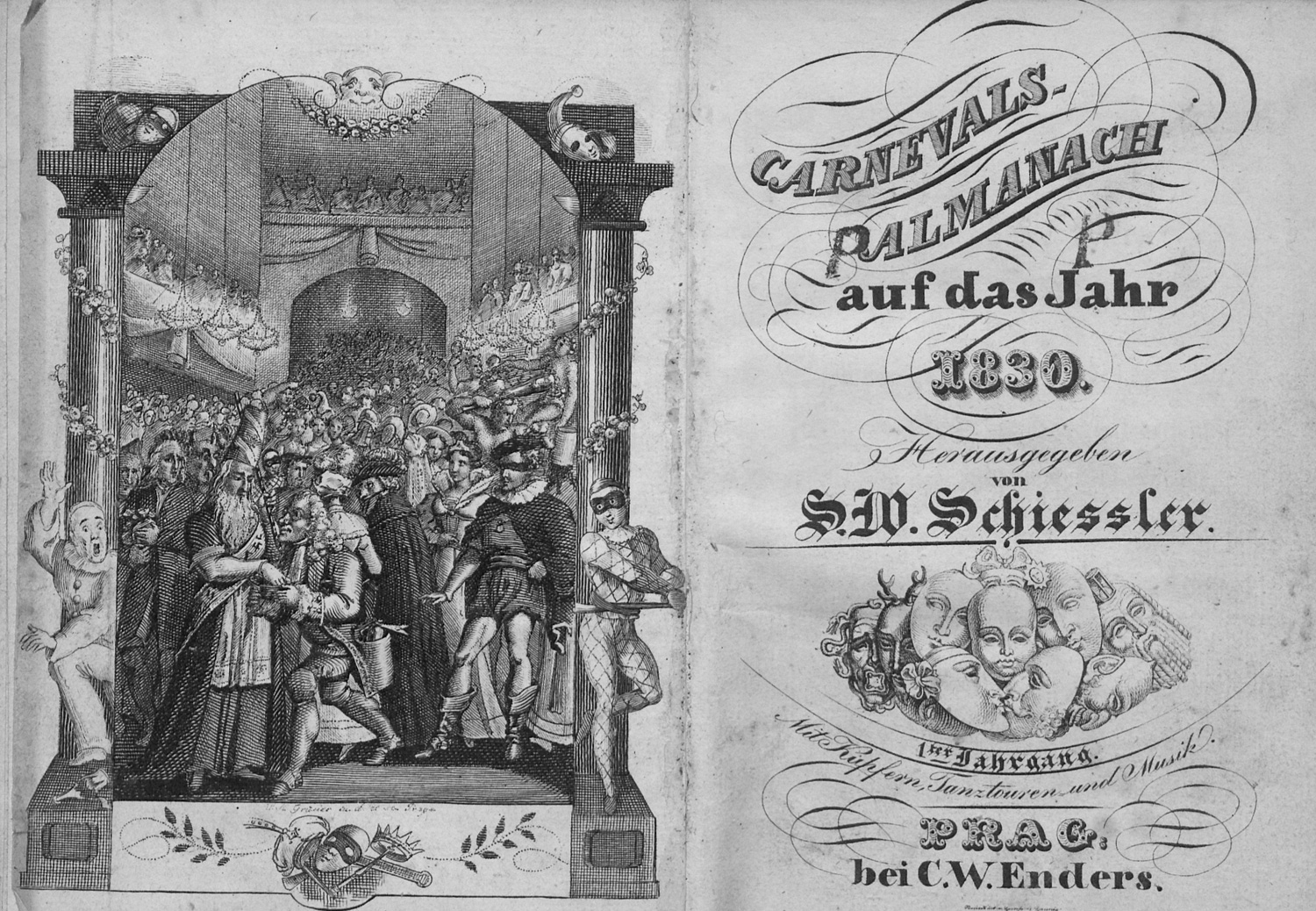 Carnevals-Almanach auf das Jahr 1830. Herausgegeben von S. W. Schiessler. Erster Jahrgang (alles Erschienene). 310 S., 1 Bl. Mit gestochenem Titel mit Vignette, gestochenem Frontispiz, 11 (statt 12) kolorierten Kostümkupfern, 10 gestochenen Seiten "Tanz-Touren" und 24 gestochenen Seiten "Noten". 13 x 9 cm. Halbleder d. Z. (stärker fleckig, berieben und bestoßen, Kapitale lädiert). Prag, C. W. Enders, (1829).