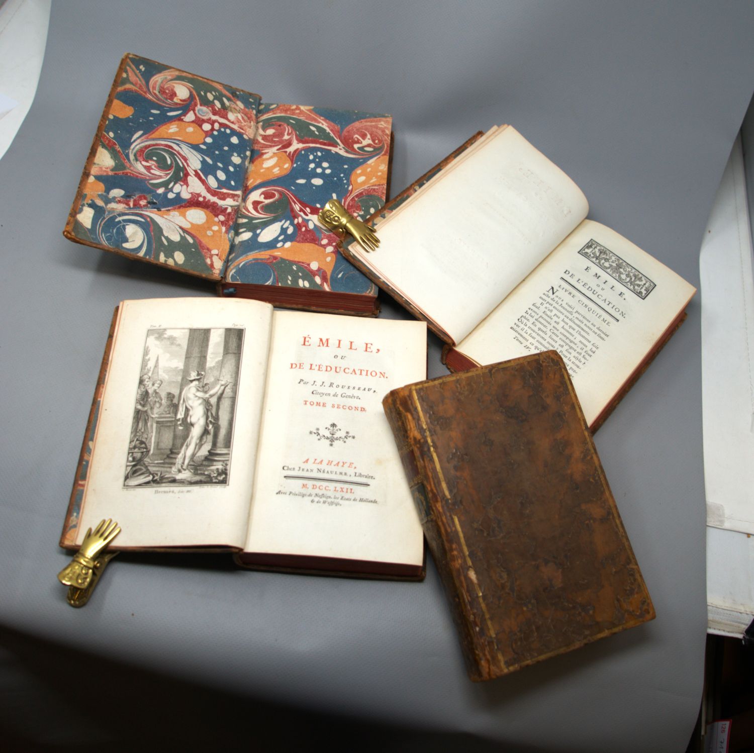 Rousseau, Jean-Jacques. Émile, ou de l'éducation. 4 Bände. Titel in Rot und Schwarz. Mit 5 Kupfertafeln nach Eisen. 19 x 12,5 cm. Marmorierte Kalbslederbände d. Z. (etwas beschabt und berieben) mit ornamentaler RVergoldung, je 2 goldgeprägten RSchildern (Band II fehlt eines) und dreifachen Deckelfileten. "A La Haye, Chez Jean Néaulme" (d. i. Paris, Duchsene), 1762.