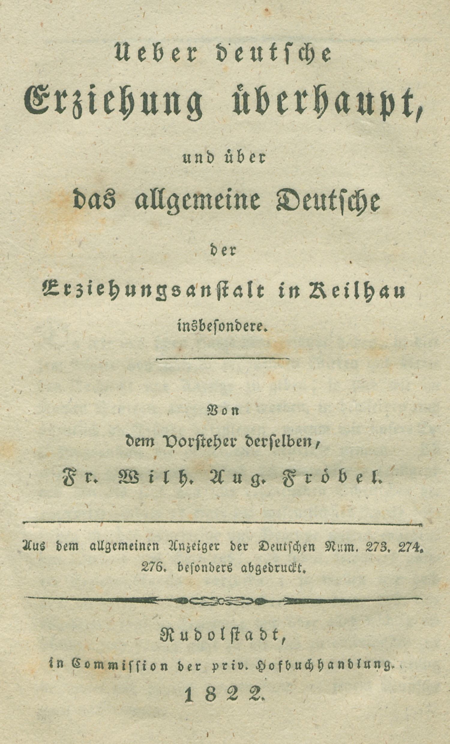 Fröbel, Friedrich Wilhelm August. Ueber deutsche Erziehung überhaupt, und über das allgemeine Deutsche der Erziehungsanstalt in Keilhau insbesondere. 52 S. 17,5 x 11 cm. Interimsbroschur d. Z. Rudolstadt, Hofbuchhandlung, 1822.