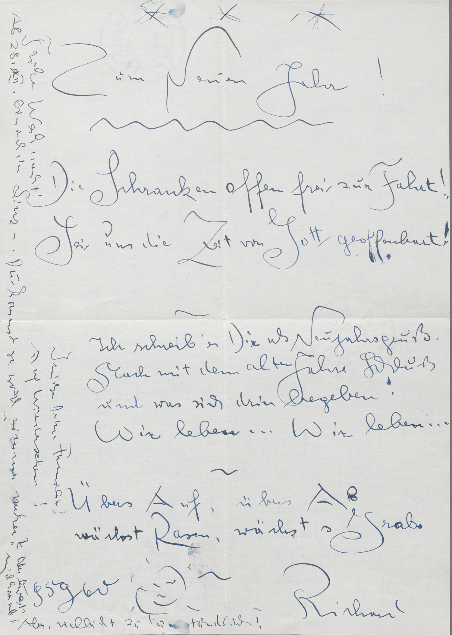 Briefgedicht mit Grüßen und Wünschen am Rand. "Zum Neuen Jahre!" 8 Zeilen: "Die Schranken offen frei zur Fahrt! / Sei uns die Zeit von Gott geoffenbart! / Ich schreib' es Dir als Neujahrsgruß. / Mach mit dem alten Jahre Schluß / und was sich drin begeben! / Wir leben ... Wir leben ... / Übers Auf, übers Ab / wächst Rasen, wächsts Grab." Am Rand noch Weihnachtsgrüße und Hoffnung auf baldiges Wiedersehen. - Gering tintenfleckig.
