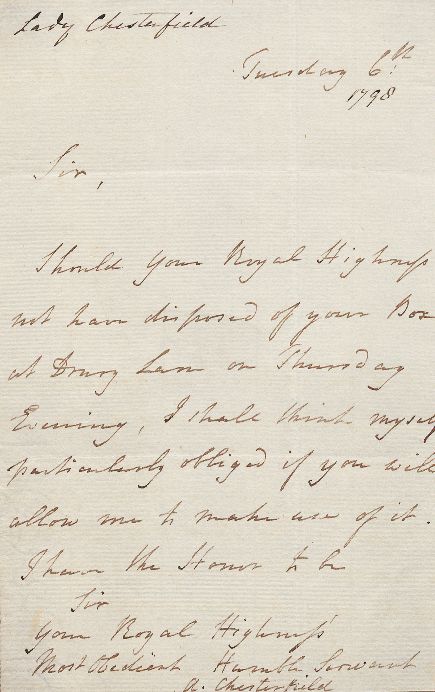 An den Diplomaten und Politiker Sir Thomas Robinson, den späteren Baron Grantham, wegen der Verschiebung einer Einladung. "Lord Chesterfield makes his compliments ... and desires that the appointment with Mr. Wilton may be put off till Thursday morning. He having been very much out of order these two days, and being not yet well enough to venture out today ...". - Eine untere Ecke abgeschnitten. - Dabei: Lady Anne Thistlethwayte Stanhope (1759-1798). Eigh. Brief m. U. "A. Chesterfield". 1 S. O. O. 1798. - Aus ihrem Todesjahr an eine königliche Hoheit, deren Loge im Drury Lane Theatre sie gern benutzen möchte. "... Should your Royal Highness not have disposed of your Box at Drury Lane on Thursday Evening, I shall think myself particularly obliged if you will allow me to make use of it ...".