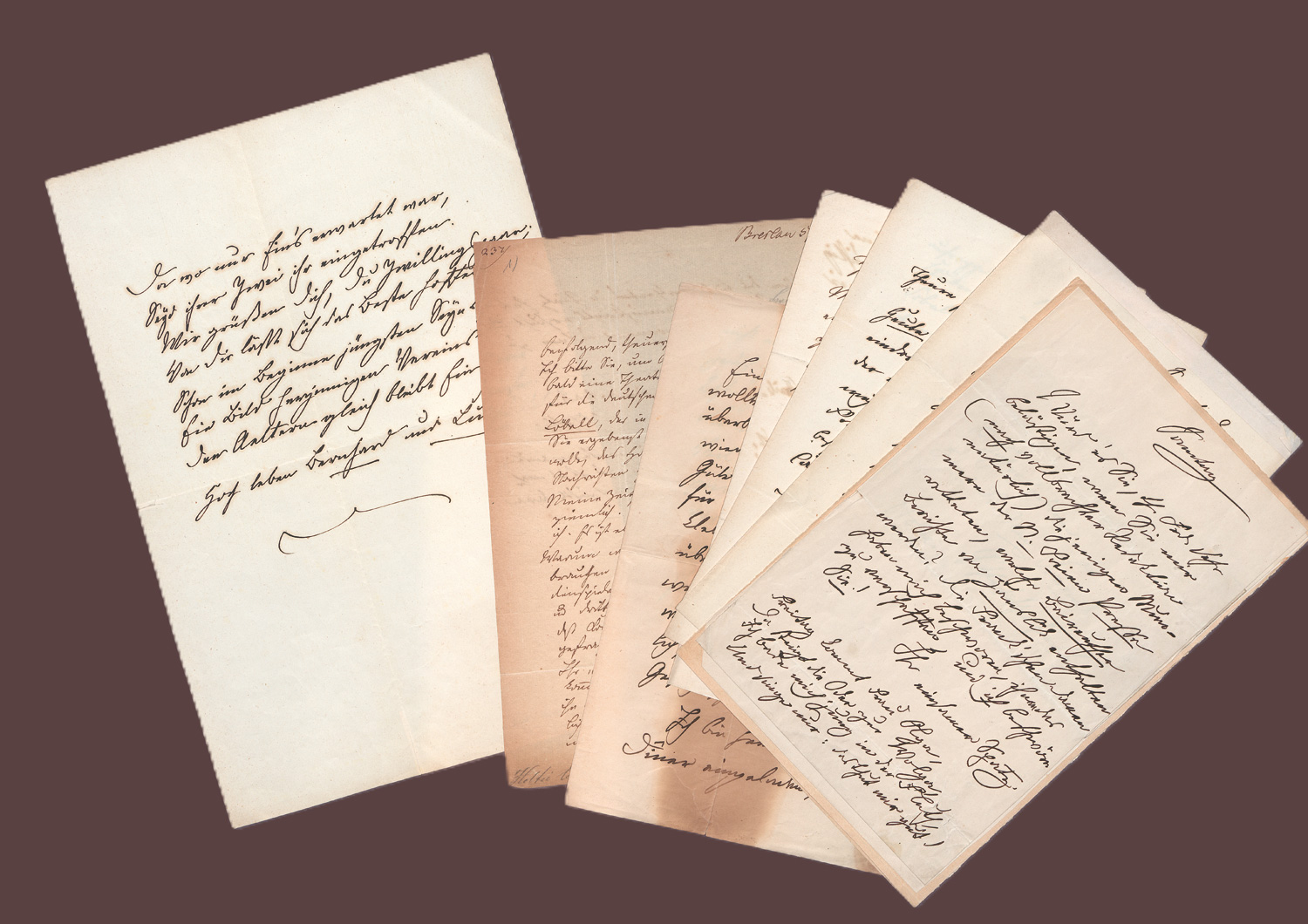Holtei, Carl von, aus Breslau stammender Dichter, Erzähler, Bühnenautor, Schauspieler, Regisseur, Rezitator und Theaterleiter (1798-1880). Sammlung von 9 eigh. Briefen und 1 eigh. Gedichtmanuskript. Zus. 17 S. Gr. 4to und gr. 8vo. 1823-1873.