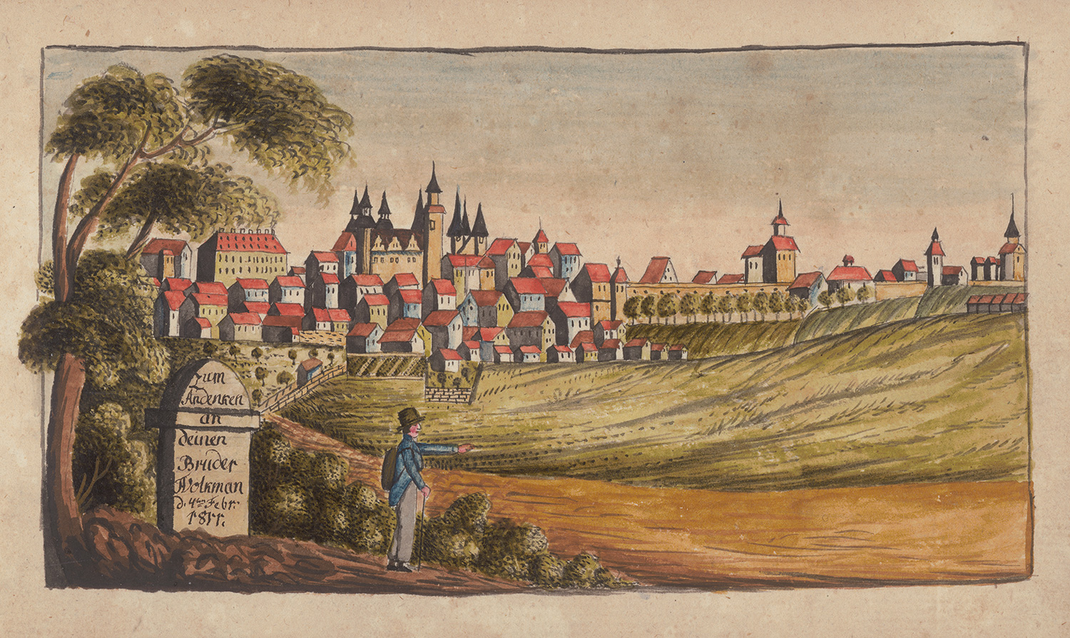 Fast alle Eintragungen von Freundinnen und Freunden in Merseburg. Eines der Aquarelle zeigt eine hübsche farbige Gesamtansicht von Merseburg, gefertigt vom "Bruder Friedrich Volckmann" der Stammbuch-Inhaberin. Ein anderes Blatt enthält eine Landschaft mit einer Vase im Mittelpunkt, darüber eine aus den Wolken kommende Hand, die eine Waage mit den Schalen "Liebe" und "Schmerz" hält. Die anderen reizvollen Malereien, teils mit Deckfarben, zeigen Blumengebinde. - Lose beiliegend 1 Blatt mit Aquarell von 1820, ferner 2 vielleicht nicht hierzu gehörige Blätter mit einer Blumenstickerei bzw. einem kolor. Kupferstich. - Stellenweise leicht gebräunt, sonst gut erhalten.