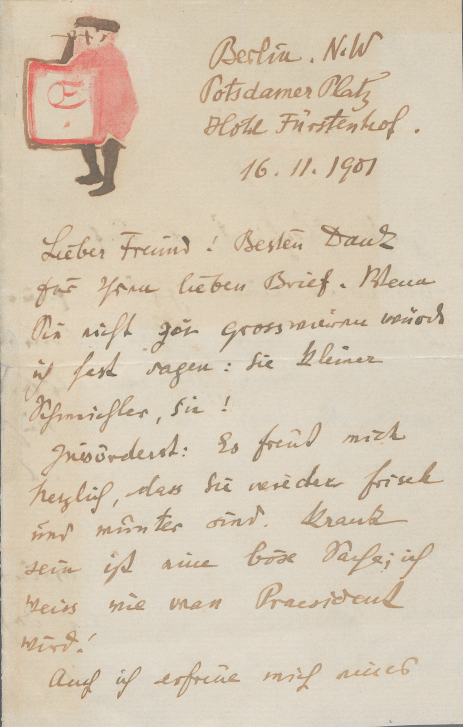 Orlik, Emil (1870-1932). Eigh. Brief m. U. "Emil Orlik". 4 S. Doppelblatt. Mit einer aquarellierten Kopf-Vignette mit den Initialen EO. 8vo. Berlin, Potsdamer Platz, Hotel Fürstenhof, 16.XI.1901.