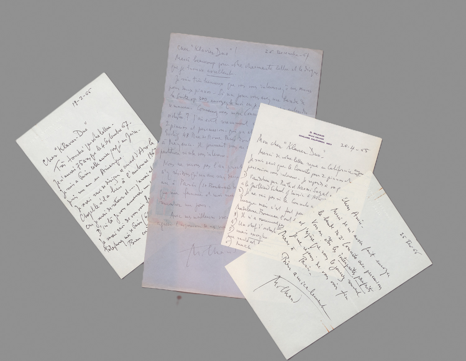 Milhaud, Darius, franz. Komponist (1892-1974). 5 eigh. Briefe m. U. "Milhaud". Zus. 51/2 S. Folio, 4to und gr. 8vo. Oakland, Paris und Aspen 1964-1966.