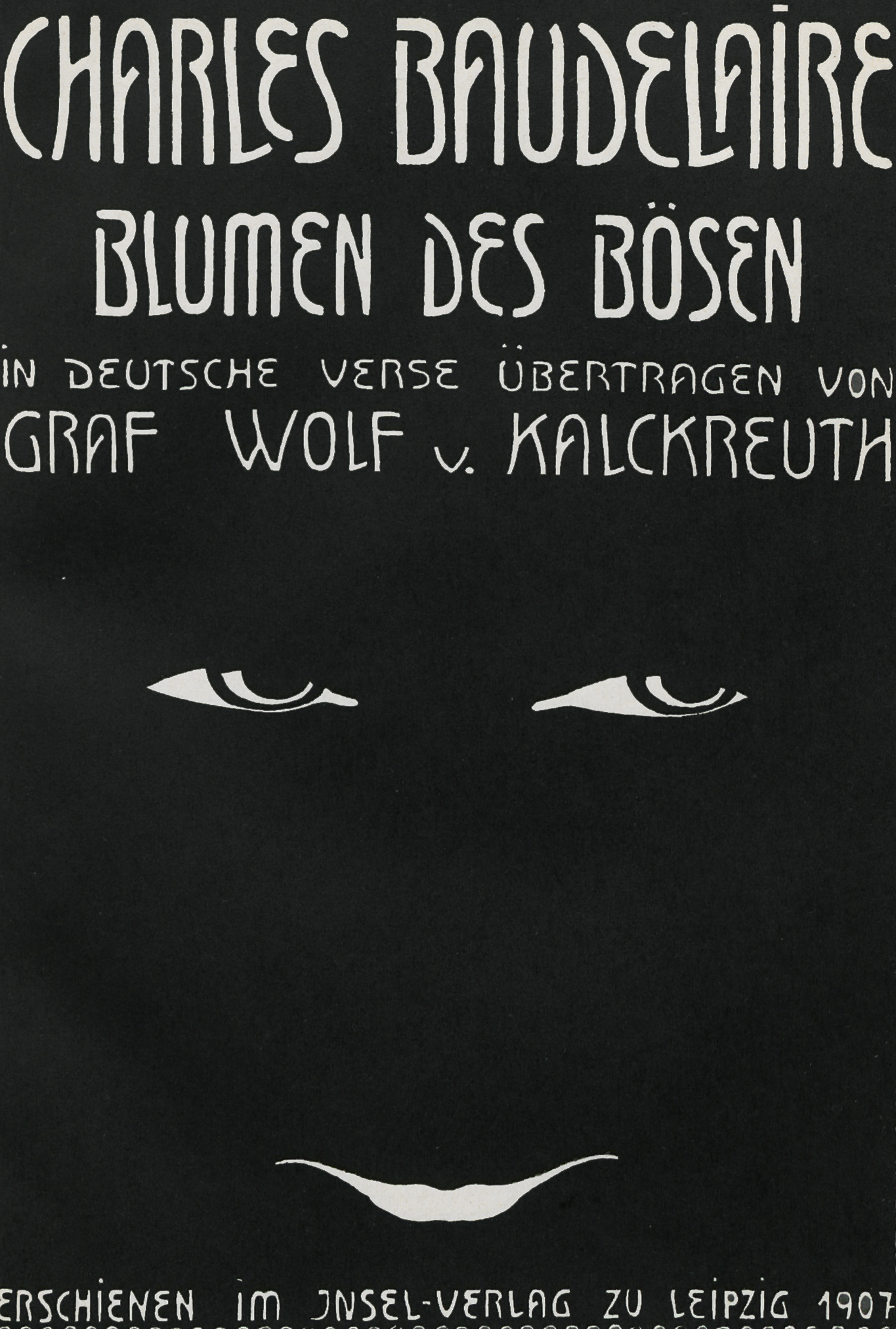 Baudelaire, Charles. Blumen des Bösen. In deutsche Verse übertragen von Graf Wolf von Kalckreuth. 3 Bl., 155 S., 2 Bl. 18,5 x 13,5 cm. Mit illustriertem Titel und 6 Vignetten von Heinrich Wilhelm Wulff. Weinroter flexibler OLederband (Rücken minial ausgeblichen) mit goldgeprägtem Rücken- und Deckeltitel sowie KGoldschnitt in schlichtem Pappschuber. Leipzig, Insel, 1907.