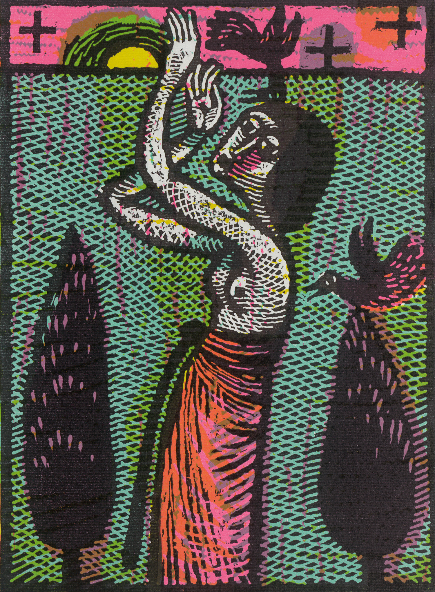 Darstellung einer stilisierten weiblichen Figur mit freiem Oberkörper und um die Hüften gelegtem Tuch, in einer Landschaft mit zwei Bäumen, Vögeln und Kreuzsymbolen. Im Hintergrund versinkt eine große Sonnenscheibe am Horizont in einer Abendstimmung. Der Himmel ist in Rosafarbe getaucht. Die Figur erhebt die Hände in einer Geste wie zu einem Gebet. – Im weißen Rand leichte Lagerspur.