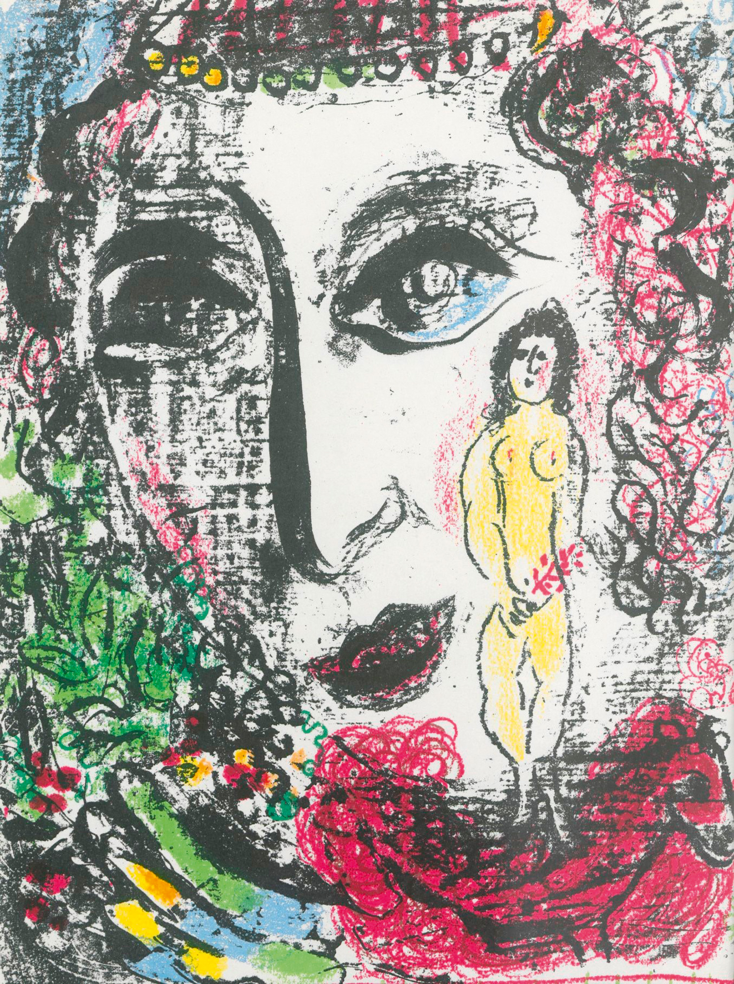 Chagall, Marc. - Cain, Julien. Chagall Lithographe II-III (von VI) 1957-1968. 208 S., 1 Bl.; 179 S., 1 Bl. Mit 13 (inkl. 2 Umschlägen) Orig.-Lithographien von Marc Chagall. 32,5 x 25 cm. OLeinenband mit farbig illustriertem OSchutzumschlag, Band II in Pappschuber. (Monte Carlo), A. Sauret, 1963-1969.
