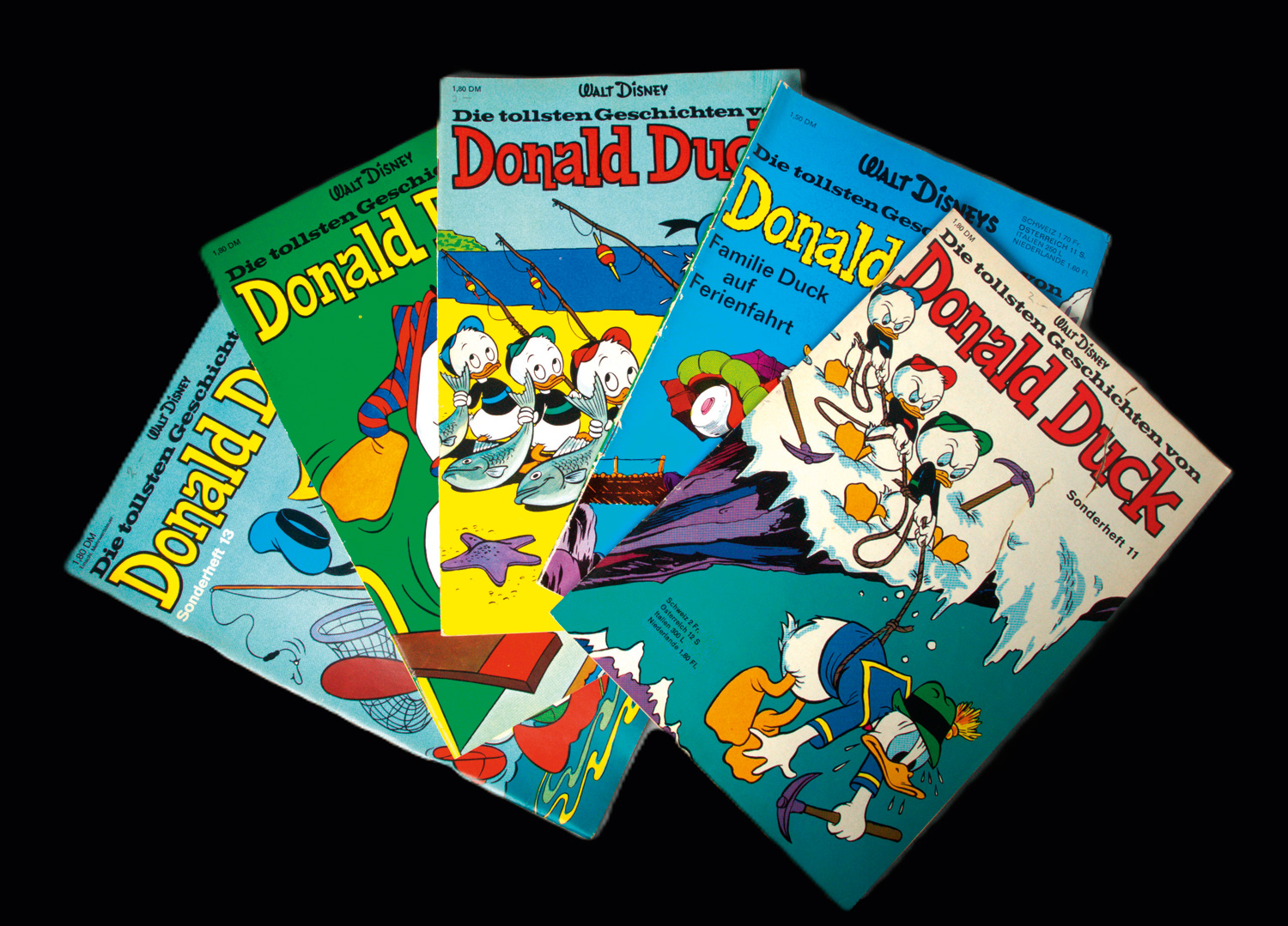 Comics. - Disney, Walt. Donald Duck. 5 Hefte. Mit zahlreichen farbigen Abbildungen. 26 x 17 cm. Illustrierte OUmschläge (berieben und mit leichten Handhabungsspuren). Stuttgart, Ehapa-Verlag, 1957-1968.