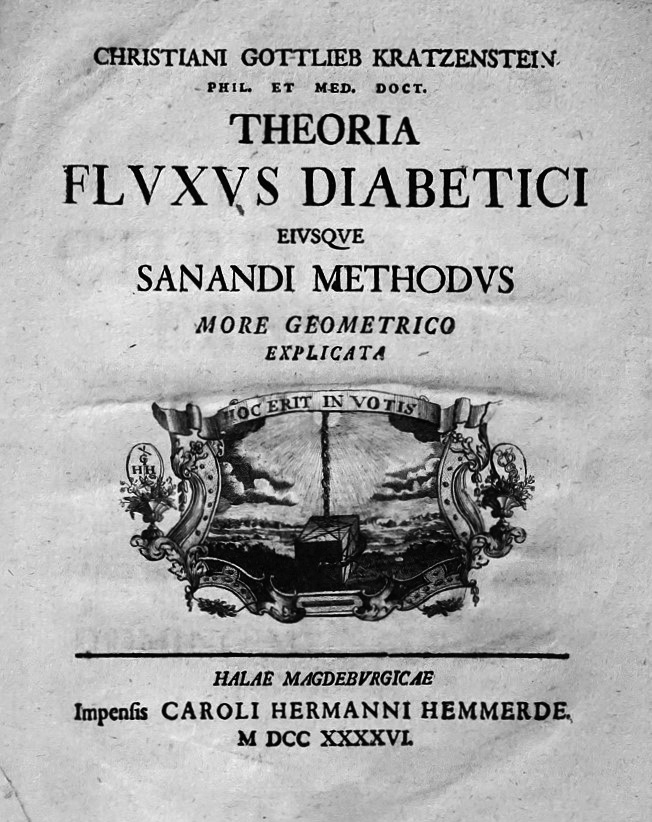Hirsch-Hübotter III, 603. NDB XII, 677f. – Sehr seltene erste Ausgabe der "Theoria fluxus diabetici". Kratzenstein hatte "1746 sein Studium als Dr. phil. und doctor medicinae mit den Schriften 'Theoria electricitatis more geometrico explicata' und 'Theoria fluxus diabetici' ab[geschlossen] und war danach bis 1748 als Professor für Physik an der Universität Halle tätig. Dann folgte er einem Ruf als Professor für Mathematik und Mechanik an die Akademie in Sankt Petersburg. Hier erweiterte er sein physikalisches Arbeitsgebiet durch navigatorische Untersuchungen und schuf beziehungsweise verbesserte mehrere nautische Instrumente (zum Beispiel Magnetnadel, nautische Uhr), die er auf Reisen nach Skandinavien und Sibirien erprobte." (NDB XII, 677f.).