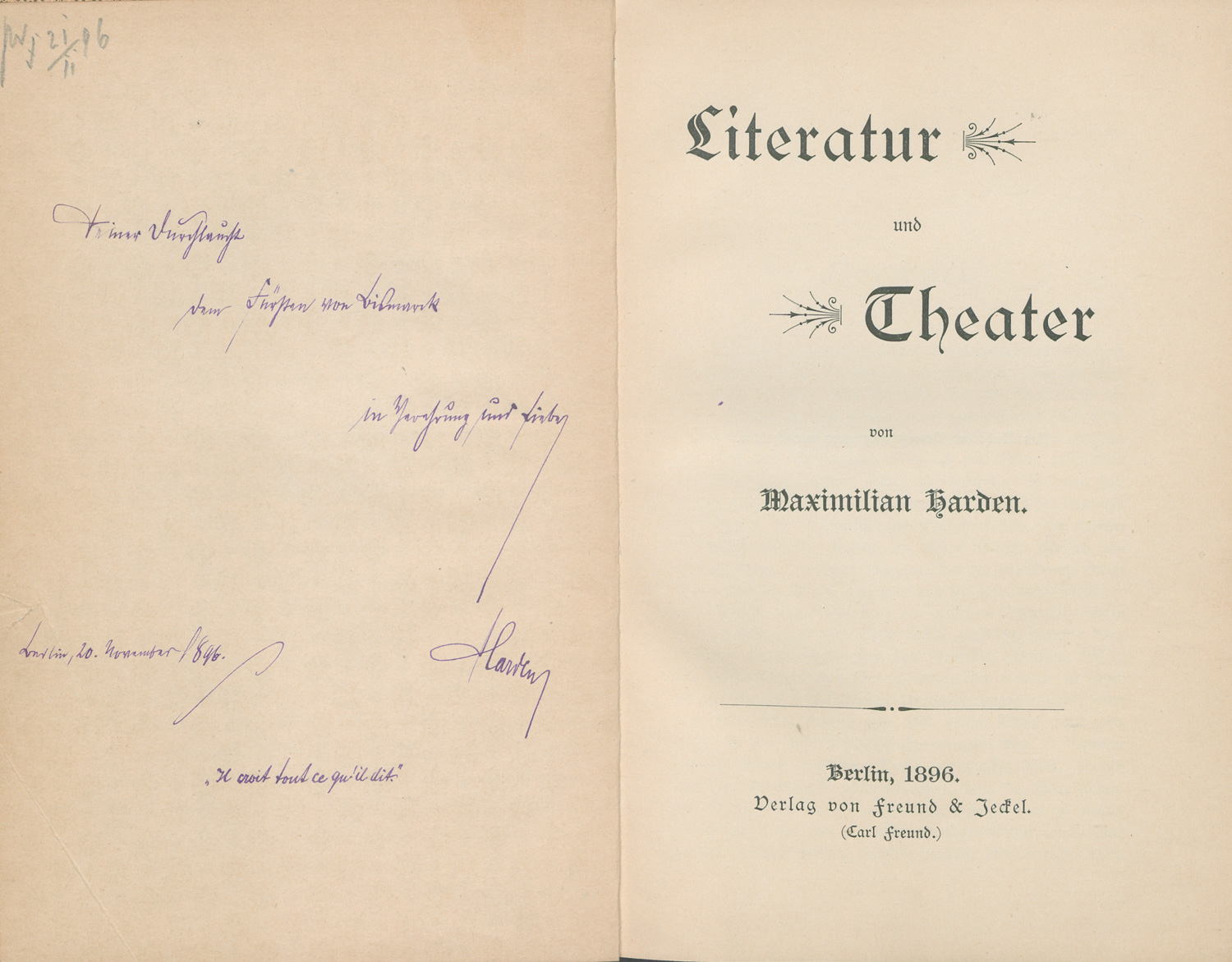 Wilpert-G.2 5. – Erste Ausgabe. Titelblatt verso mit eigenhändiger Widmung von Harden mit Sinnspruch ("Il croit tout ce qu'il dit") "Seiner Durchlaucht dem Fürsten von Bismarck in Verehrung und Liebe", datiert: Berlin, 20. November 1896. – Nahezu verlagsfrisch.