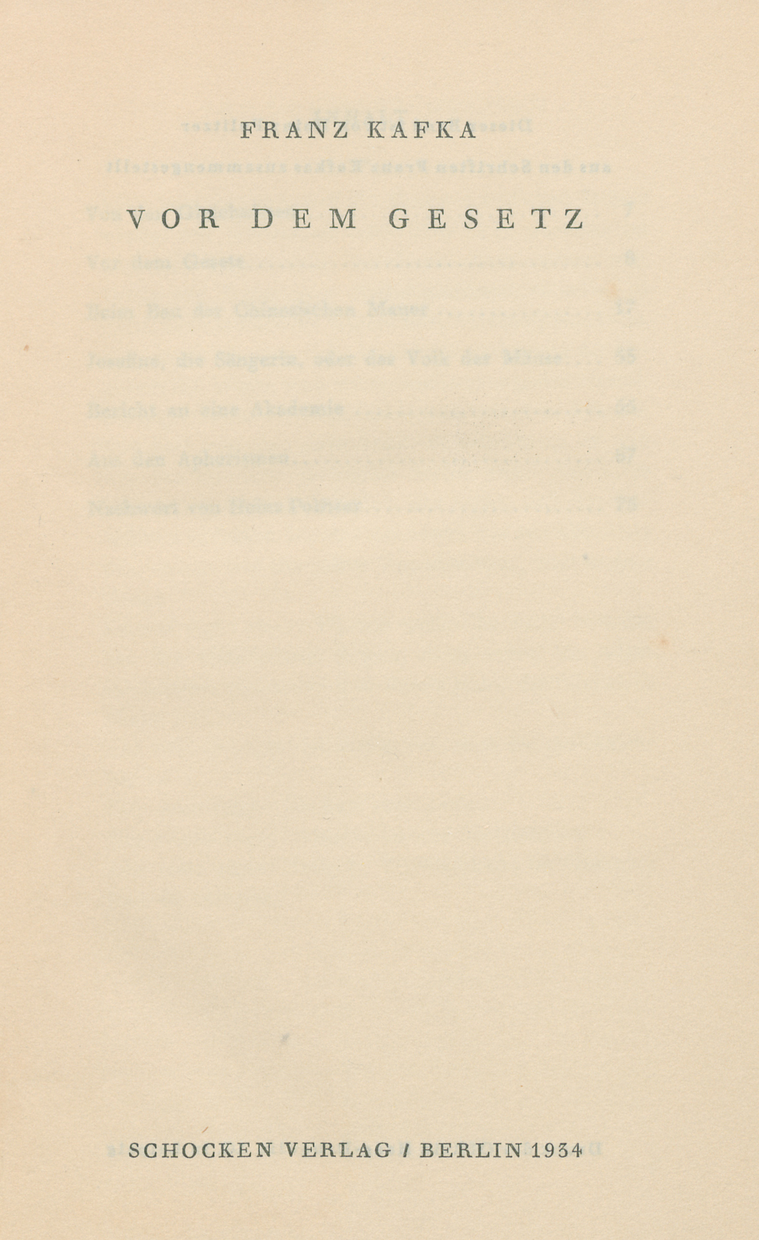Kafka, Franz. Vor dem Gesetz. (Hrsg. von H. Politzer). 80 S. 19 x 11,5 cm. OPappband (etwas gebräunt; Vorderdeckel mit minimaler Druckstelle). Berlin, Schocken, 1934.