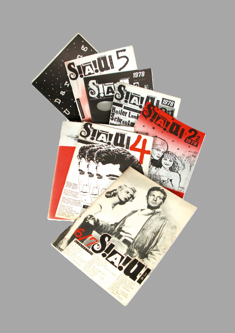 Punk-Literatur-Fanzine aus München. Aus heutiger Sicht reibt man sich die Augen, dass solcherlei dort möglich war. Autoren waren u. a. Rainer Werner Fassbinder, Wolf Wondratschek, Klaus Lemke, David Byrne, Ludwig Fels und Werner Schroeter und Herbert Achternbusch. Mit Achternbusch gab es eine Vereinbarung, dass das Magazin eingestellt werden würde, wenn dieser in der "Zeit" zitiert werden würde. Was dann auch beides geschah. – Sehr gut erhalten. – Dabei: Richard L. Wagner. Darling Ultra. S!A!U!-Produkt. 47 S. Mit zahlr. Abb. 29,5 x 21 cm. Illustr. OBroschur. München, S!A!U!-Verlag, 1979. - Vlado Kristl. Körper des Unrechts. S!A!U!-Produkt. 50 Bl. Mit zahlr. Illustrationen. 29,5 x 21 cm. Illustr. OBroschur. München, S!A!U!-Verlag, (um 1979).
